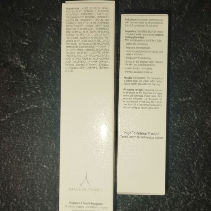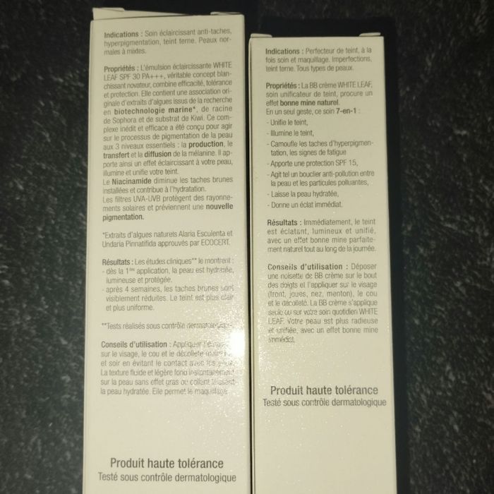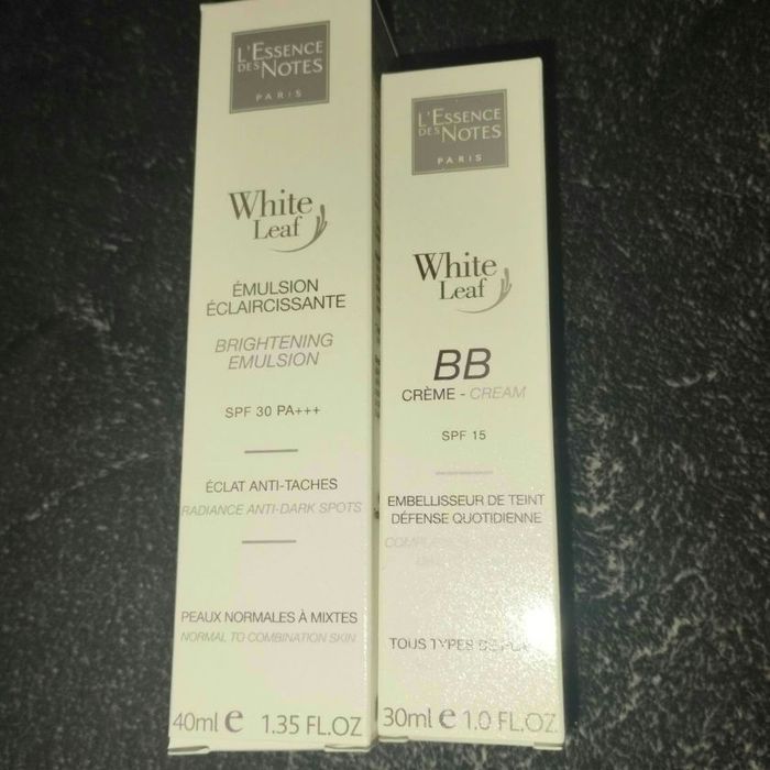 Lot de 2 produits visage : 1 Émulsion éclaircissante anti taches de la marque l essence des notes white leaf. 1 creme bb couleur neutre de la marque l essence des notes white leaf spf15 embellisseur de teint defense quotidienne.