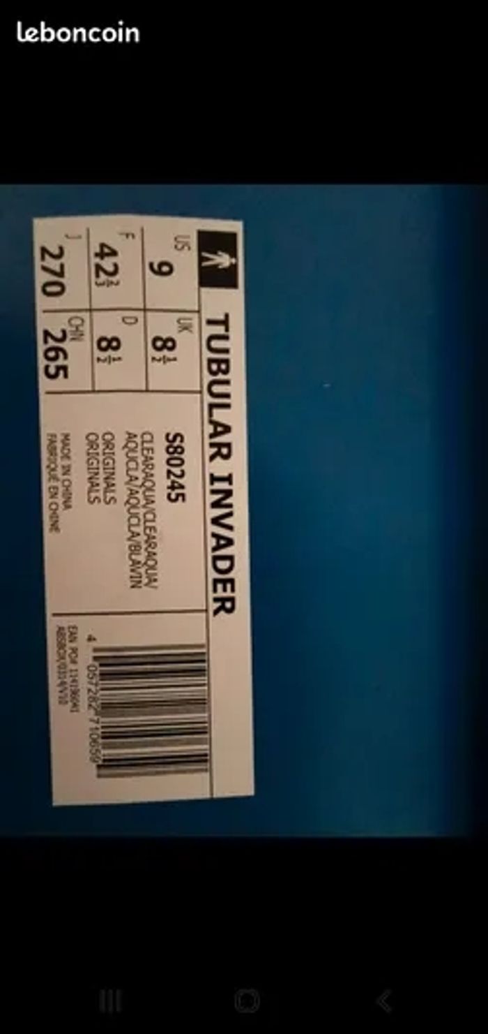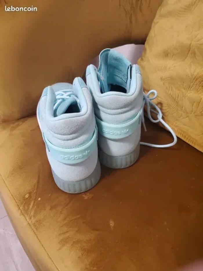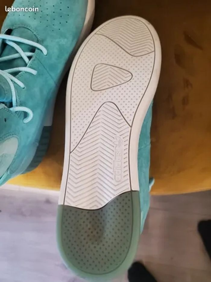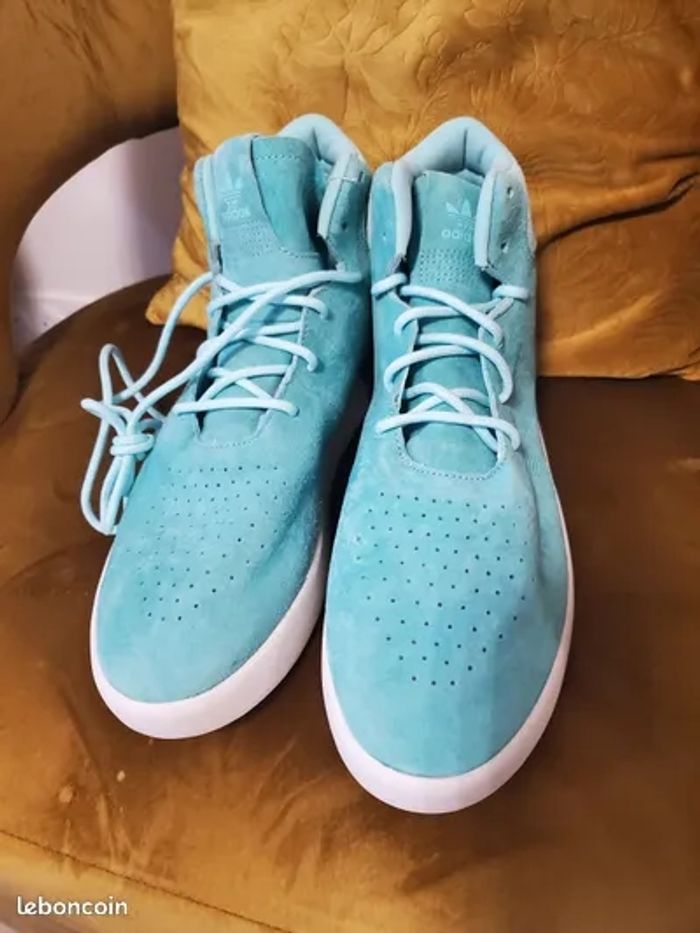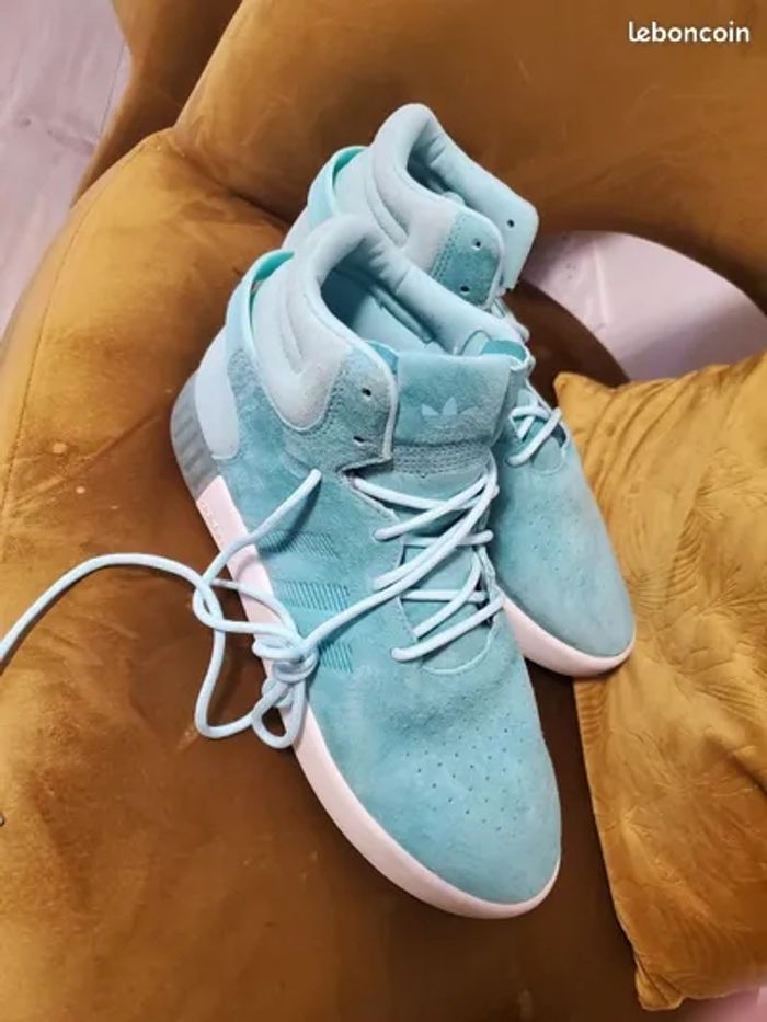 Vend superbe paire de Basket Adidas Tubular Invader de couleur turquoise, jamais portée. A vendre puisque très serrée. Taille : 42.2/3 ( presque 43 ).