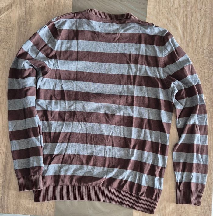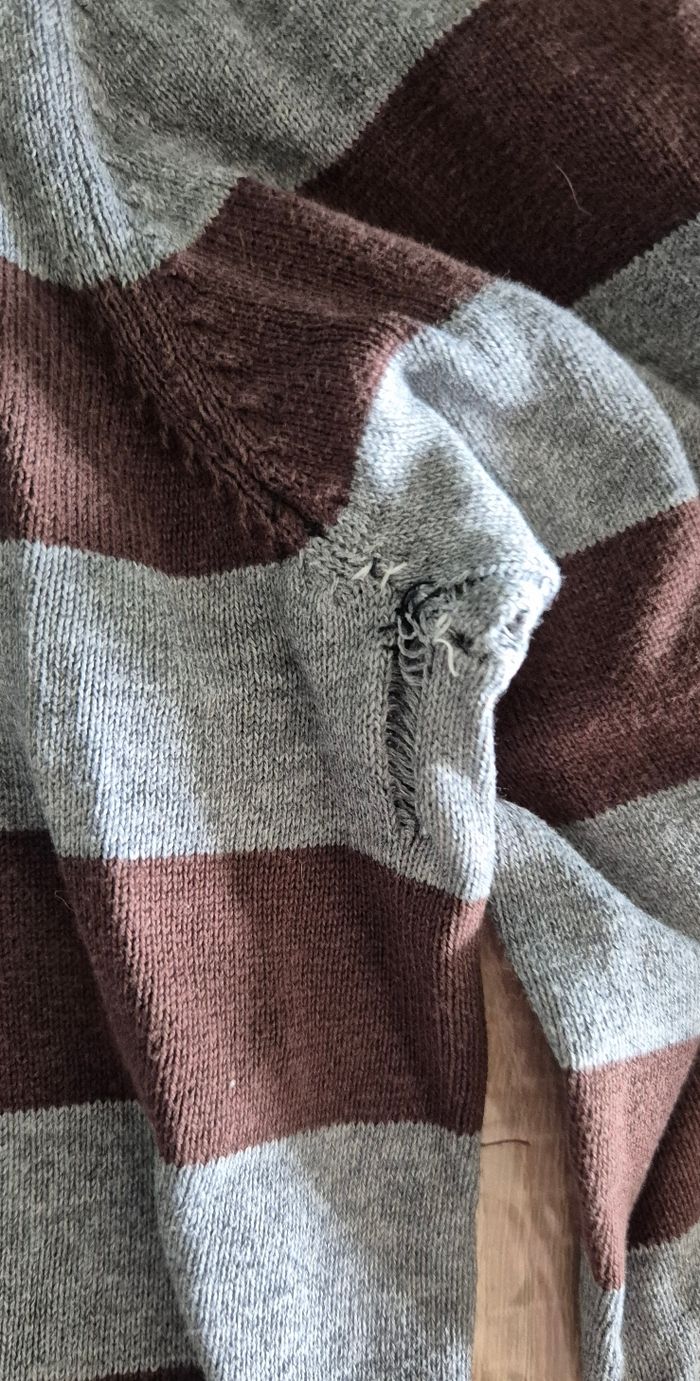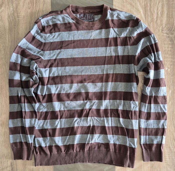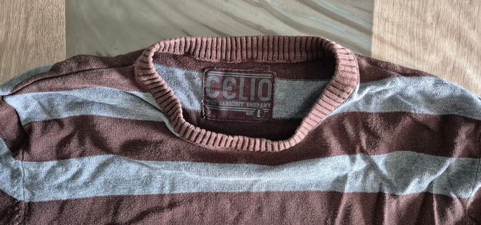 Bonjour Je vends un pull Celio à rayures marron et grises. Caractéristiques : * Marque : Celio * Taille : S * Couleur : Marron et gris * Coupe : Col rond, manches longues * État : Bon état général, à noter un petit trou au niveau de l'aisselle droite (voir photo). Facilement réparable pour une personne à l'aise avec la couture. Idéal pour une tenue décontractée. N'hésitez pas, j'envoie rapidement.