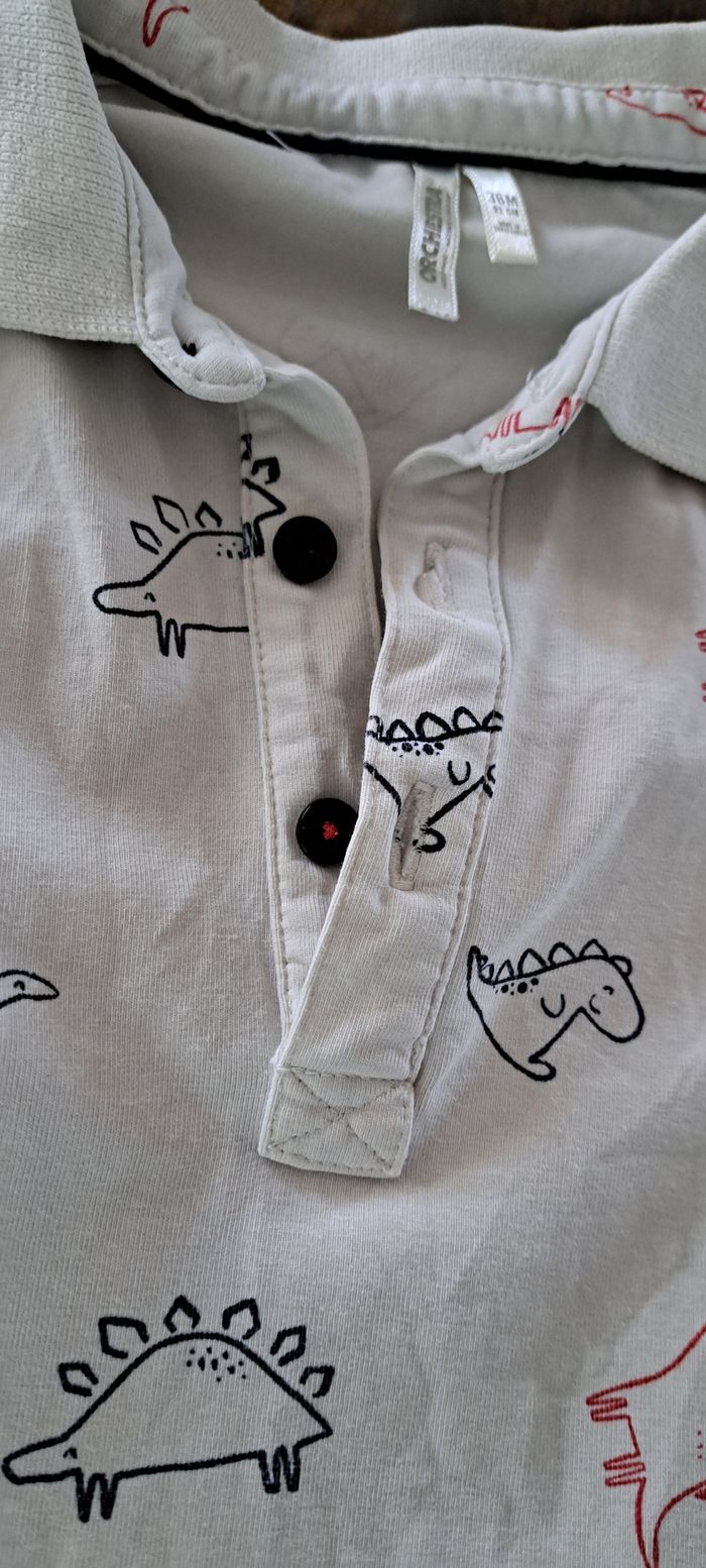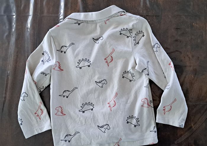 Polo manches longues avec col Marque orchestra Taille 36 mois / 92 cms Peu porté, en très bon état Couleur crème avec motifs dinosaures
