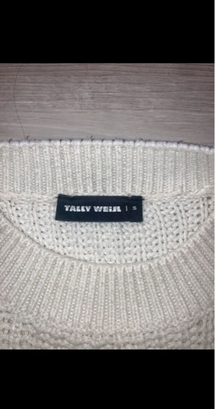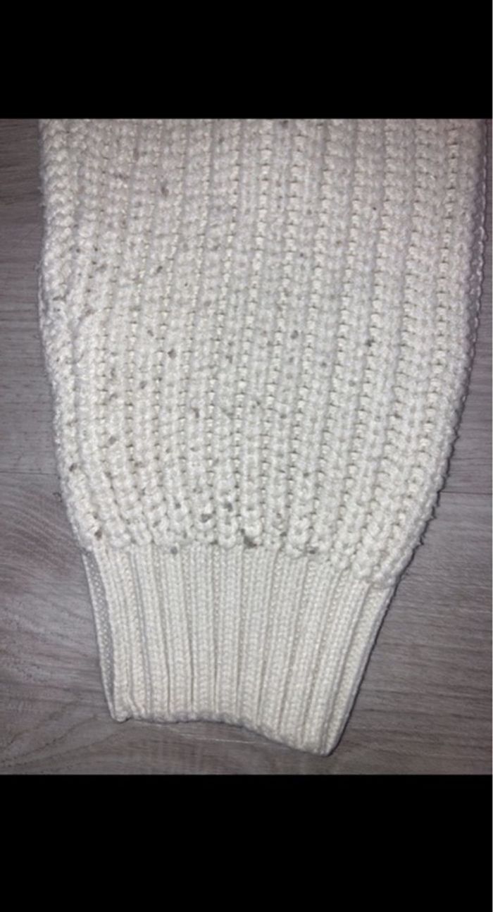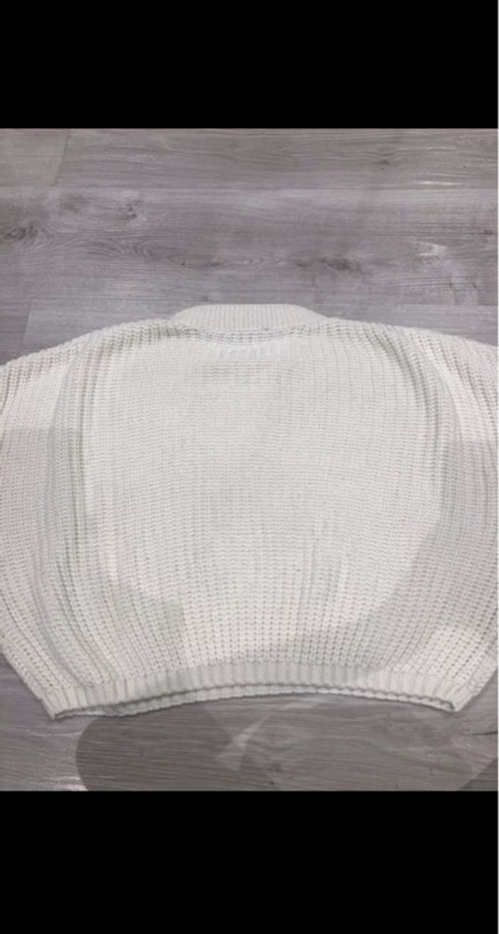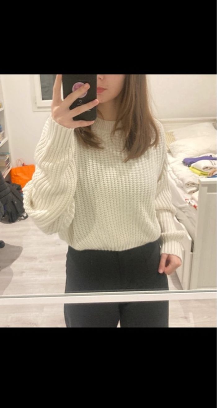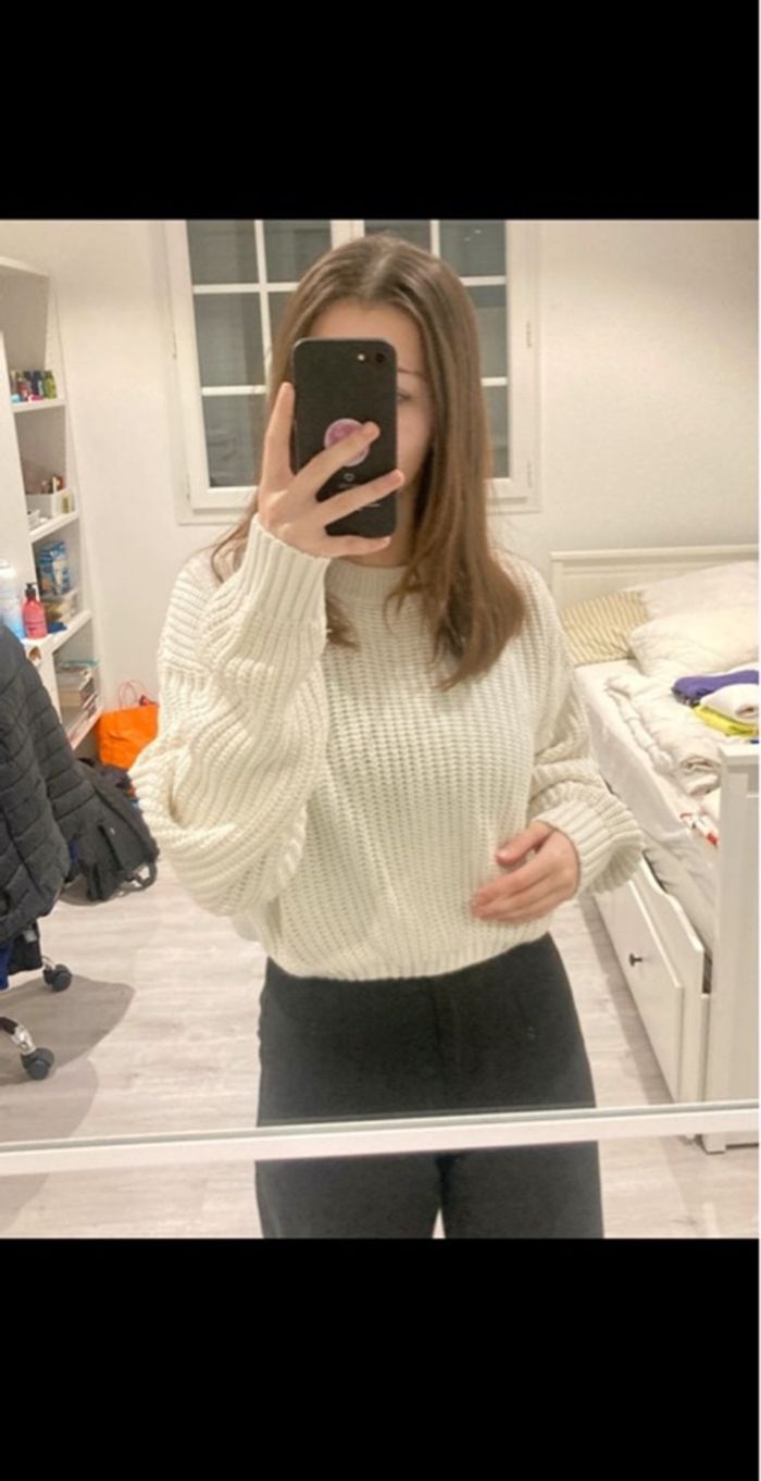 Pull en maille blanc, porté plusieurs fois. Légèrement court et un peu large. Taille S mais correspond à du 34/36.