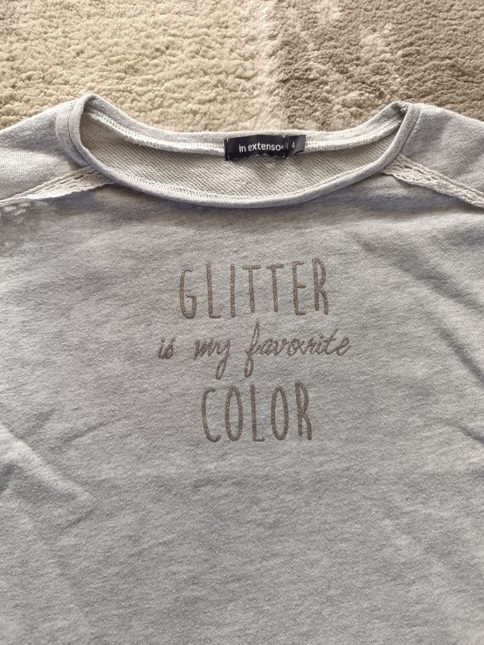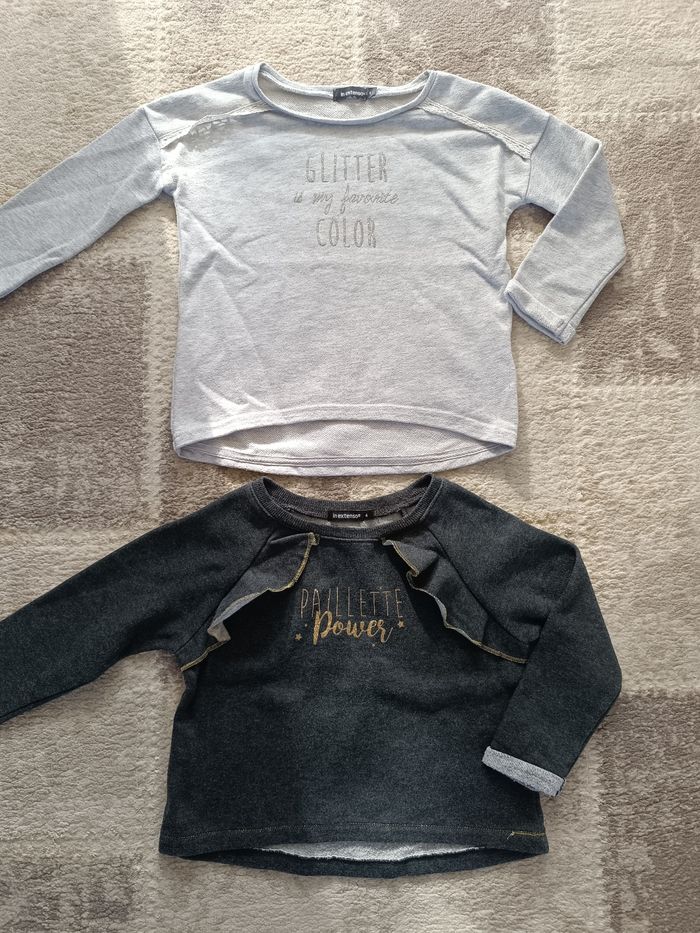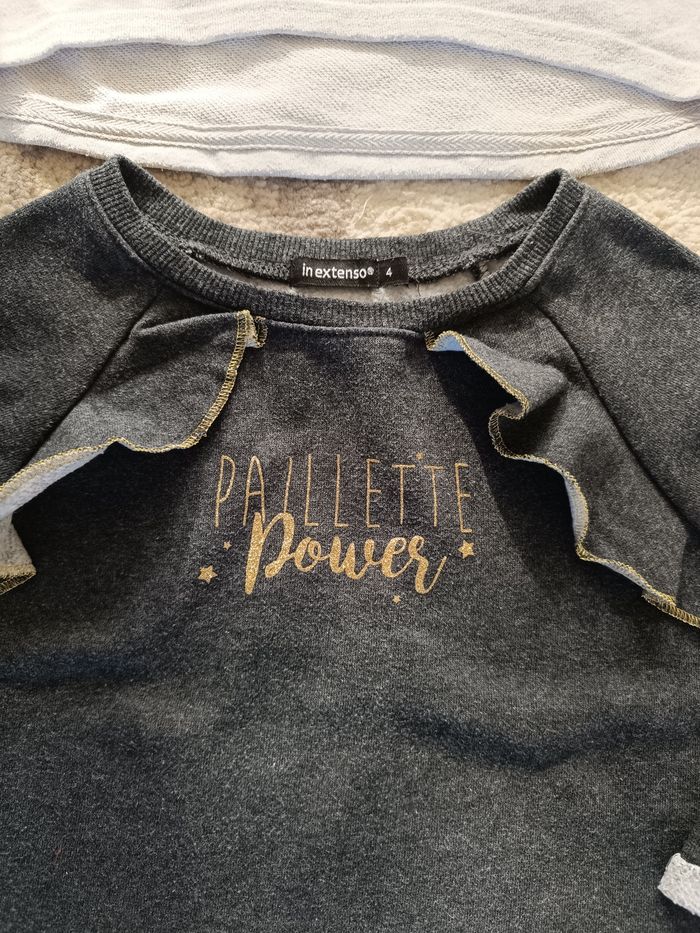 Un pull gris clair inscription argenté in extenso 4 ans et un pull gris foncé inscription doré intérieur doublé in extenso 4 ans