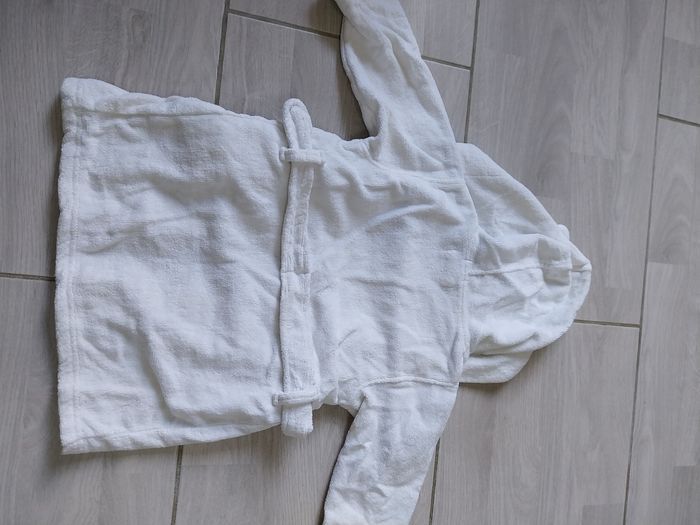 Peignoir à capuche tête d'Ours, 2 poches, 1 ceinture qui est cousue derrière ( bébé ne peut pas jouer avec). 1 petite tache au niveau de la manche gauche