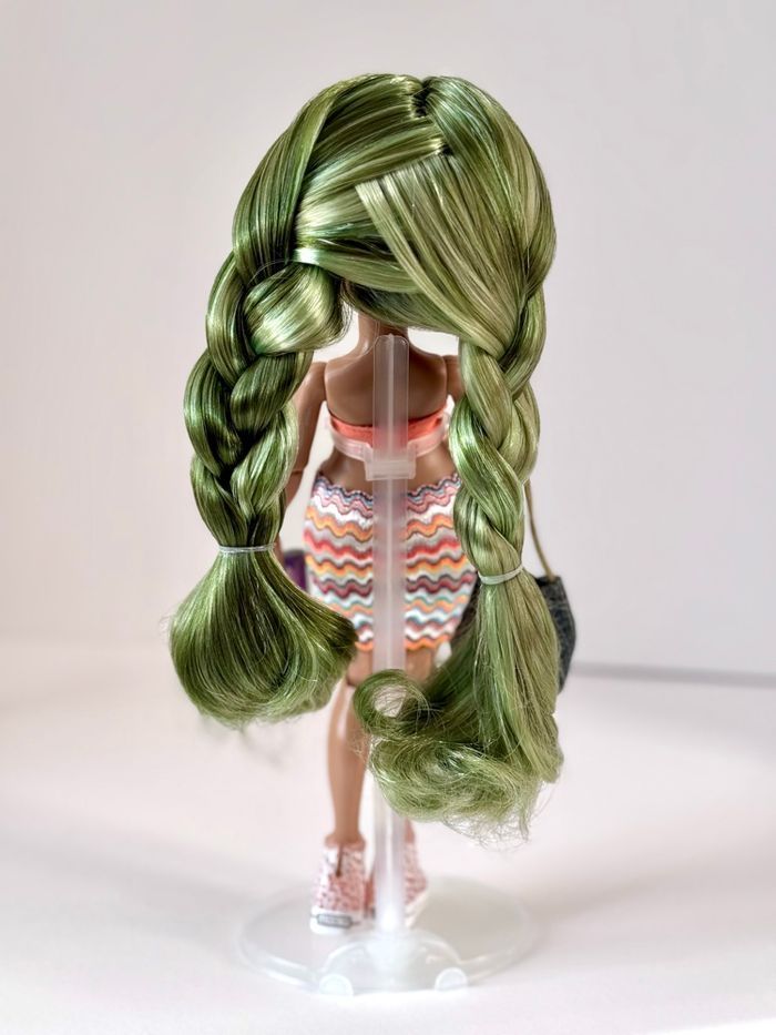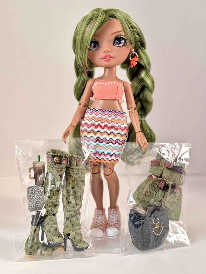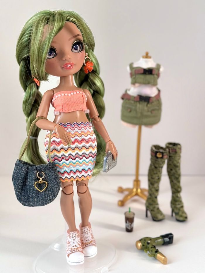 ⚠️ Le portant à vêtement n’est pas à vendre, il présente simplement la deuxième tenue. Occasion en très bon état. Une frange longue à été créée. Boucles d’oreilles, sac à main et jupe multicolore fabriqués à la main. Socle inclus. Maison non fumeur, envoi rapide et soigné
