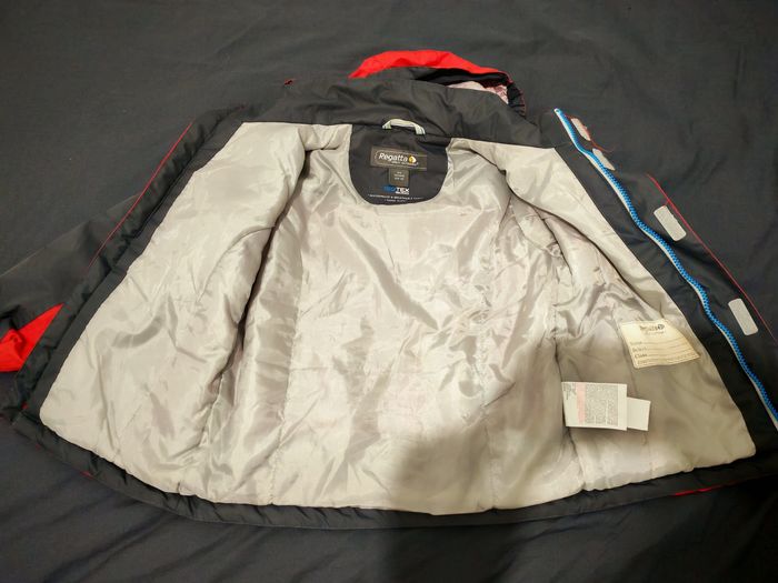 Veste de ski, de couleur rouge, de marque Regatta, taille 5/6 ans, 116cm, en bon état général, un petite tâche sur le devant (voir dernière photo)
