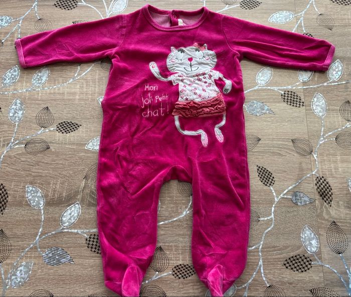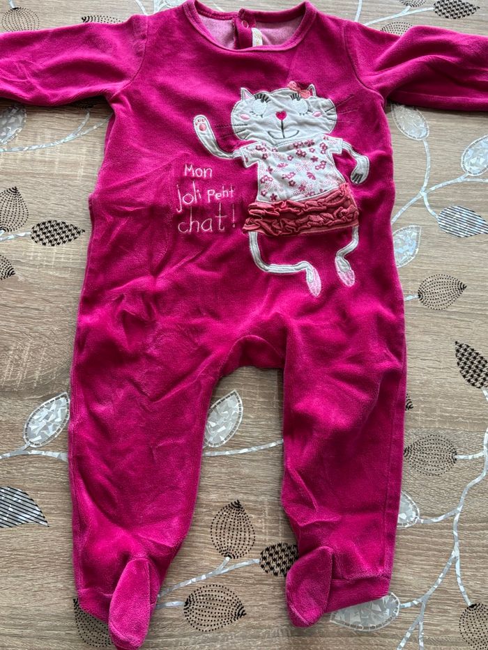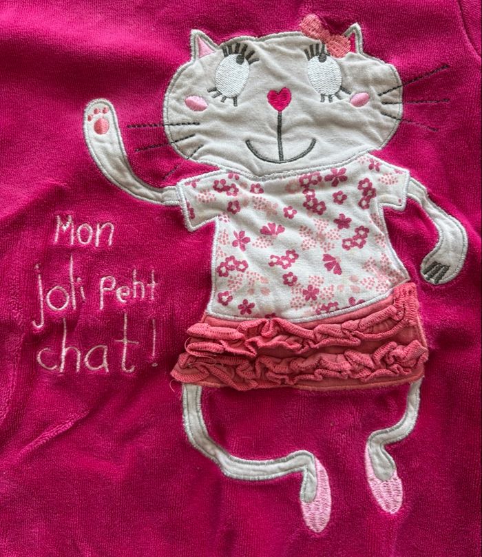 Pyjama rose fuchsia avec motif chat “Mon joli petit chat”. Bien chaud et tout doux, idéal pour l’hiver. Bon état. Taille : 12 mois Marque : Gémo