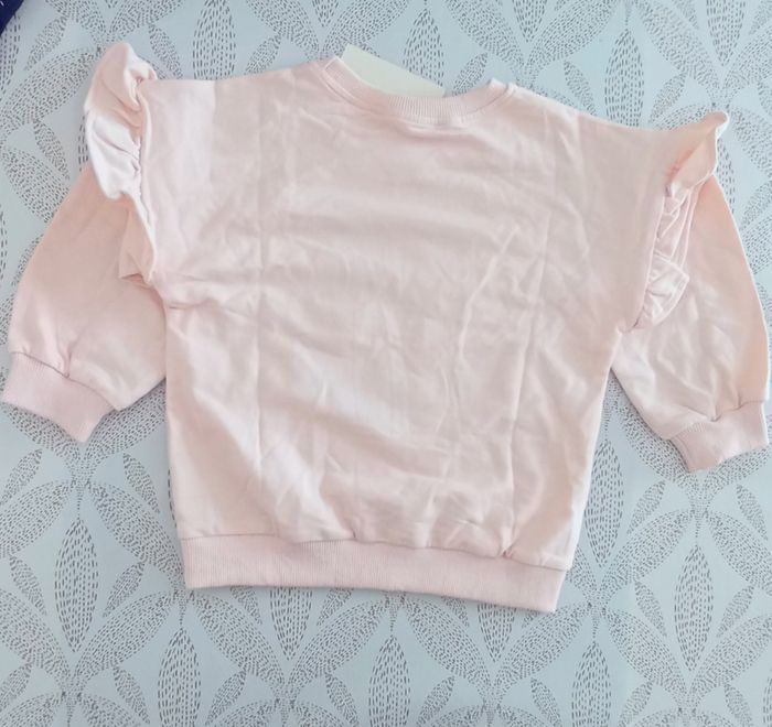 Ensemble sweat rose clair avec petits volants aux épaules et motif lapins “best friends”, + legging bleu marine, tissu extensible. Très mignon et confortable, idéal pour la mi saison 🌸