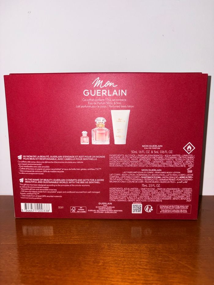 Coffret Guerlain Authentique qui contient : Une eau de parfum mon Guerlain en 50ml + sa miniature de 5ml Et son lait parfumé pour le corps de 75ml Cette fragrance associe la fraîcheur de la lavande, la sensualité de la vanille et du jasmin et la force du santal boisé Prix parfumerie : 115 Euros