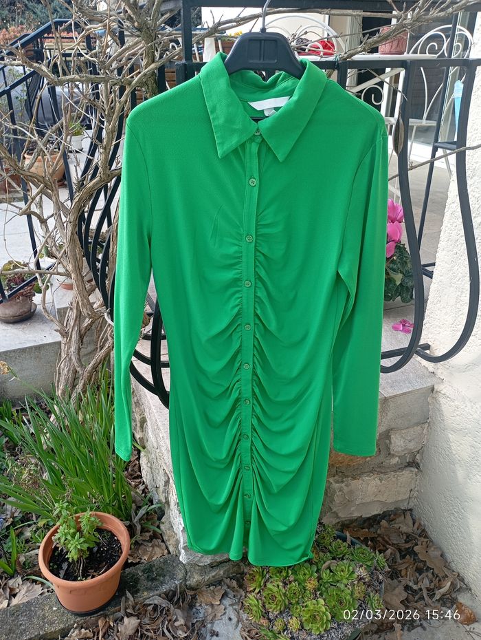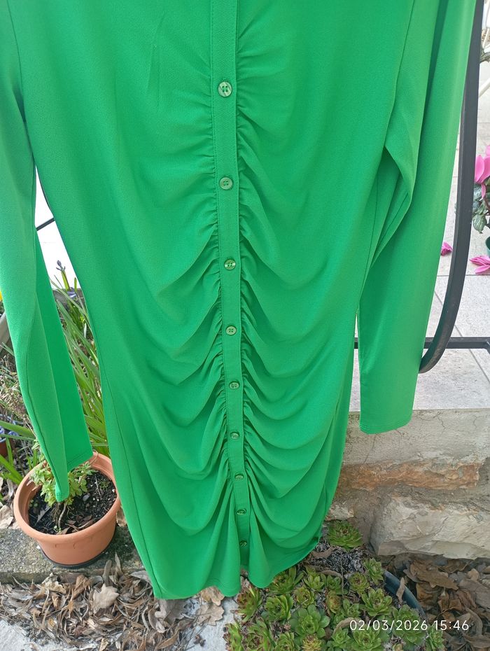 Robe verte très ceintrée. Ouverture sur le devant par boutonnage. En très bon état, voire neuve.