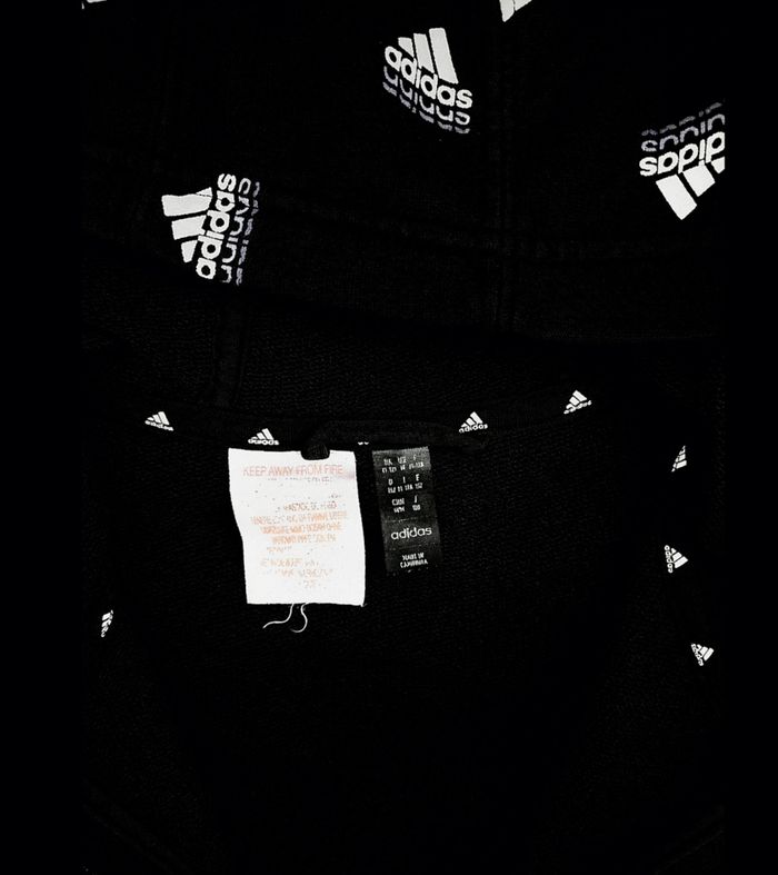 Sweat zippé à capuche noir et blanc Fille taille 11/12 ans marque Adidas ✴️ Composition => 77 % coton 23 % polyester ✴️ Couleurs => Noir et Blanc Imprimé intégral du logo Adidas "Badge of Sport" en blanc ✴️ Capuche ✴️ Fermeture éclair ✴️ Deux poches latérales