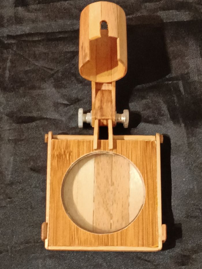 Lampe de précision artisanale, articulée,en bois avec loupe amovible pile 9 V en état cf photos hauteur max. 50 cm