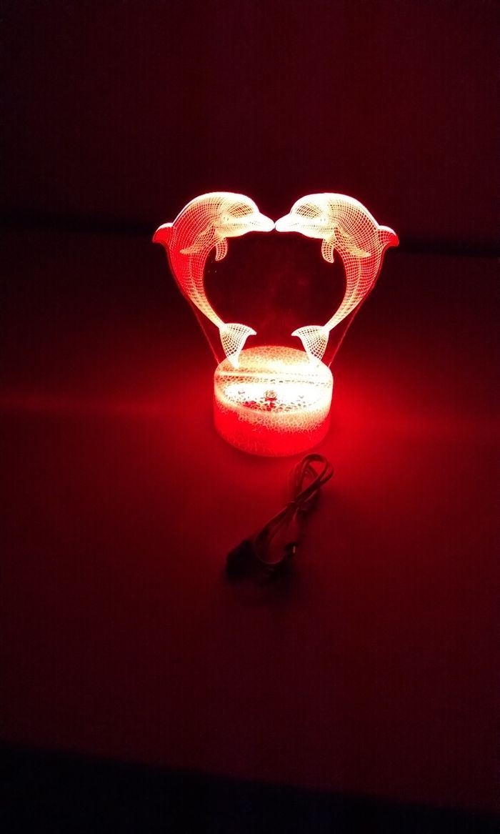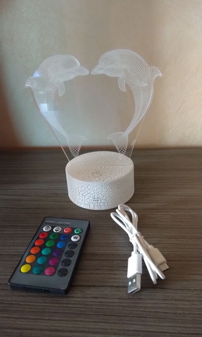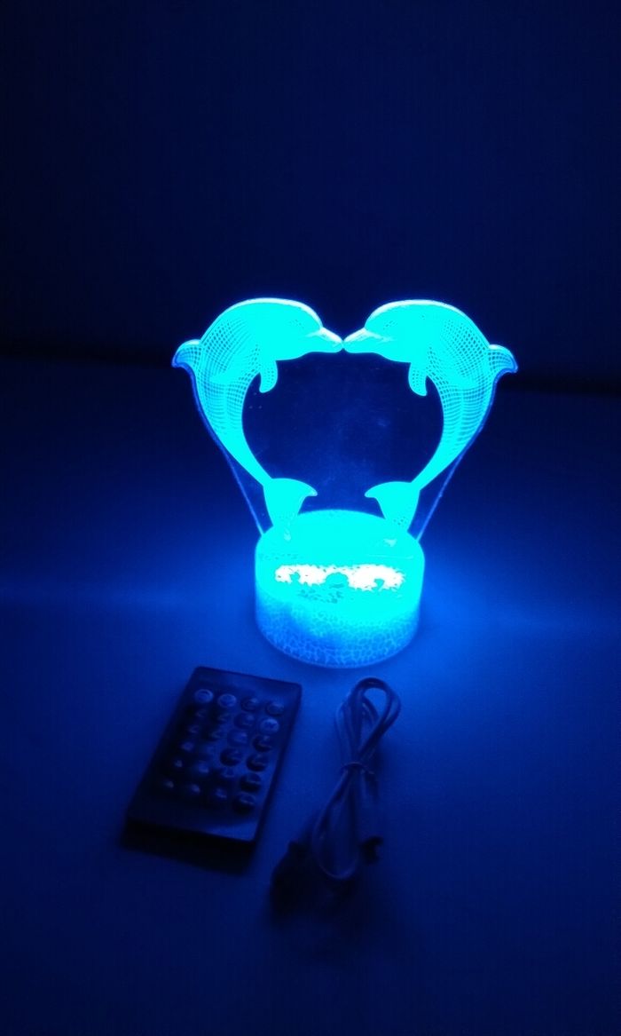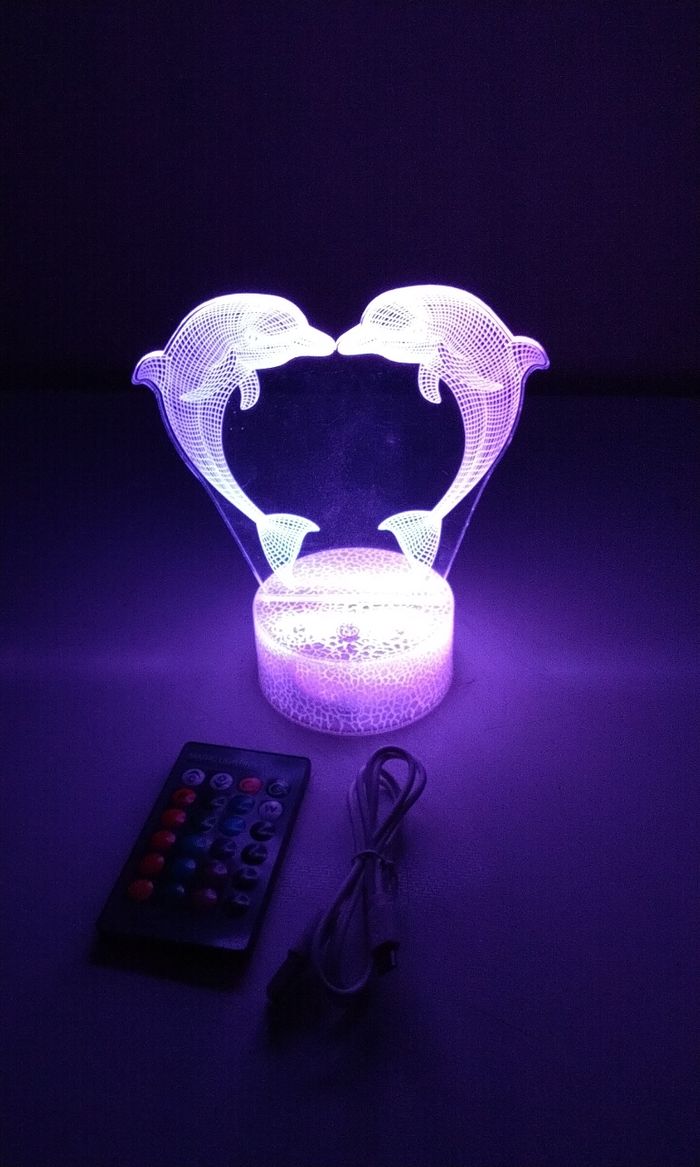 Neuf déballé allumé pour la photo. Lampe dauphin multicolore et plusieurs mode d'éclairage. Télécommande de contrôle, et touche tactile sur la lampe voir photo 6 Fonctionne à pile ou sur secteur câble fourni.