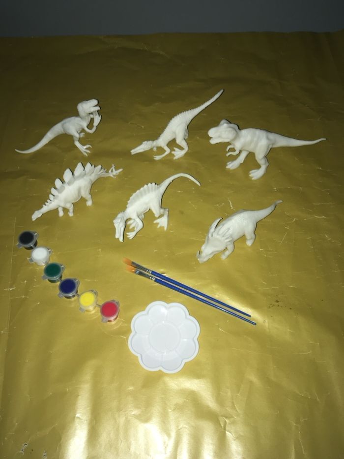 Lot de 6 dinosaures à peindre avec peinture à diluée à l’eau. Contient deux pinceau et une coupelle. Déballé du sachet pour les photos. Neuf et emballé.