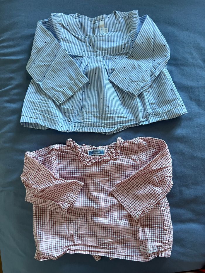 Je vends ce lot de 2 blouses Jacadi taille 12 mois état neuf. Je peux les vendre séparément si besoin.