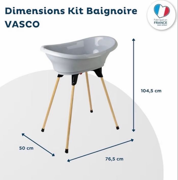 Kit complet de baignoire bébé sur pied amovible. Elle peut être utilisée en baignoire seule avec le bouchon ou avec son pieds amovible et son tuyau d'évacuation. Elle peut accueillir un transat de bain pour plus de confort, il se ventouse dans la baignoire. (Les pieds sont sortis du carton pour l’envoi) Baignoire vasco, Thermobaby, gris charme. Dimensions: 80x50x27cm Baignoire + pied français Dimensions: 50x76,5x104,5cm