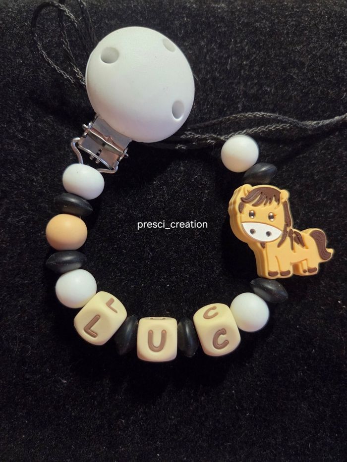 Pro dans les attaches tétines depuis 9 ans Attache tétine silicone poney chevale 🌟Fil doublé 🌟Nœud de sécurité et nœud anti coulissement 🌟Taille respecter de 22 cm Petits plur la personnalisation s des attaches : 🎀 Possibilité de mettre une prénom en fluo la nuit pour un supplément attache a 15 euro 🎀 Supplément possible aussi un adaptateur MAM pour a 1.50 euro 🎀 Possibilité de rajouter une déco si le prénom est petit pour 1.50 euro par déco Me contactez pour tout renseignements