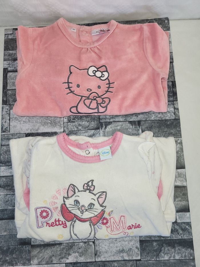 Description : Jardin Secret vous propose ce joli lot de deux pyjamas en velours, parfaits pour garder bébé bien au chaud et au doux durant la nuit. Ce lot se compose de deux pièces adorables et ultra confortables : ​Pyjama Hello Kitty : D'un beau rose gourmand, avec une grande broderie Hello Kitty sur le devant et l'inscription "Hello Kitty". ​Pyjama Marie (Disney Aristochats) : Blanc avec des manches à petits pois roses, arborant une superbe broderie de la petite chatte Marie et l'inscription "Pretty Marie". ​Marques : Hello Kitty / Disney ​Taille : 6 mois ​Matière : Velours tout doux ​Détails : * Ouverture par pressions à l'arrière pour le pyjama rose et à l'avant/entrejambe pour le blanc, idéal pour un change facile. ​Pieds intégrés pour garder les petits petons au chaud. ​État : Très bon état ✨ ​✨ Un ensemble craquant pour des nuits paisibles et stylées ! ​⚠️ LIVRAISON ULTRA RAPIDE : Je dépose vos colis TOUS LES JOURS ! J'ai mes points de collecte juste à côté de chez moi, votre commande partira donc en un temps record. 🚀✨ 📦 Envois via : Mondial Relay ou Relais Colis.