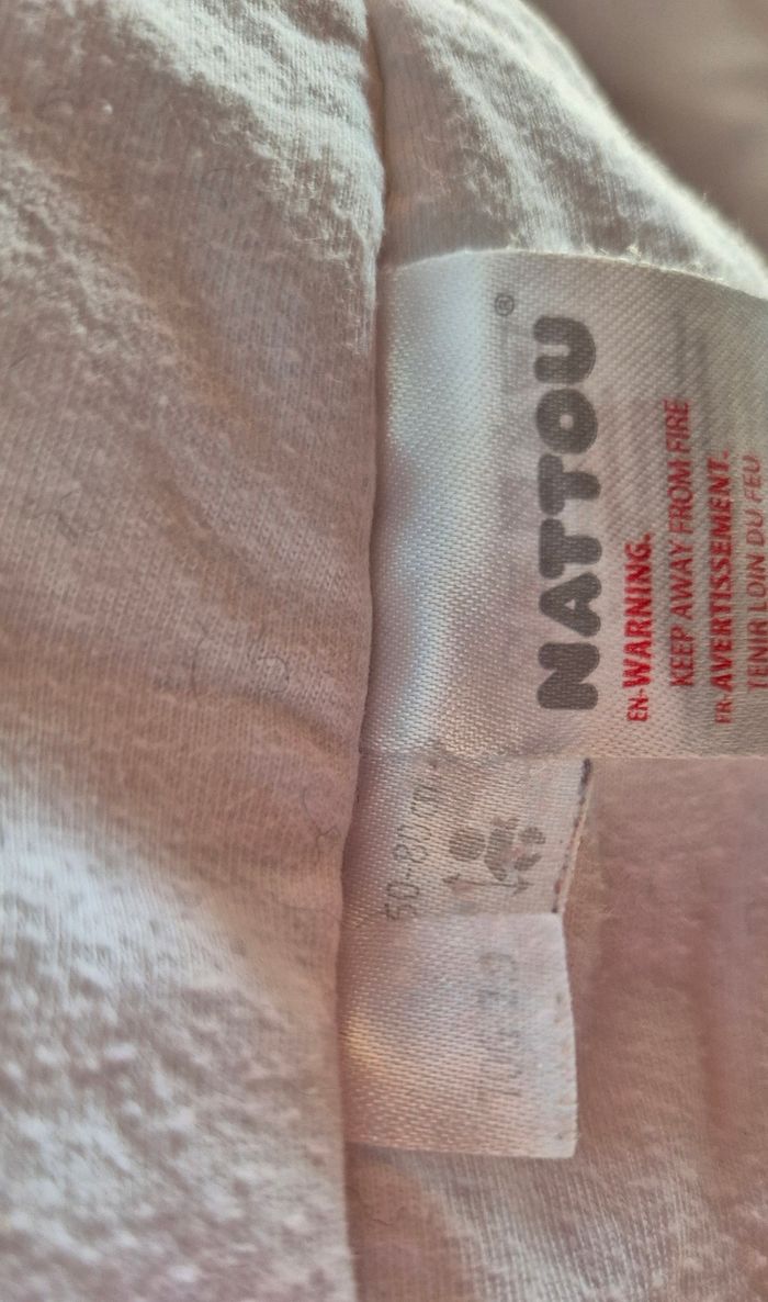 Bon etat. Tog 2,9 de 60 à 80 cm. Base de la fermeture éclair qui est un peu décousue mais ne gêne pas l'utilisation de la gigoteuse. Une autre gigoteuse Nattou est disponible dans mon dressing si vous souhaitez faire un lot.