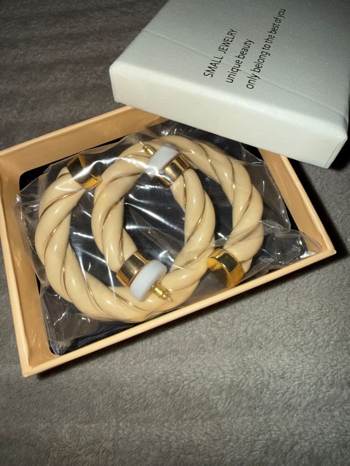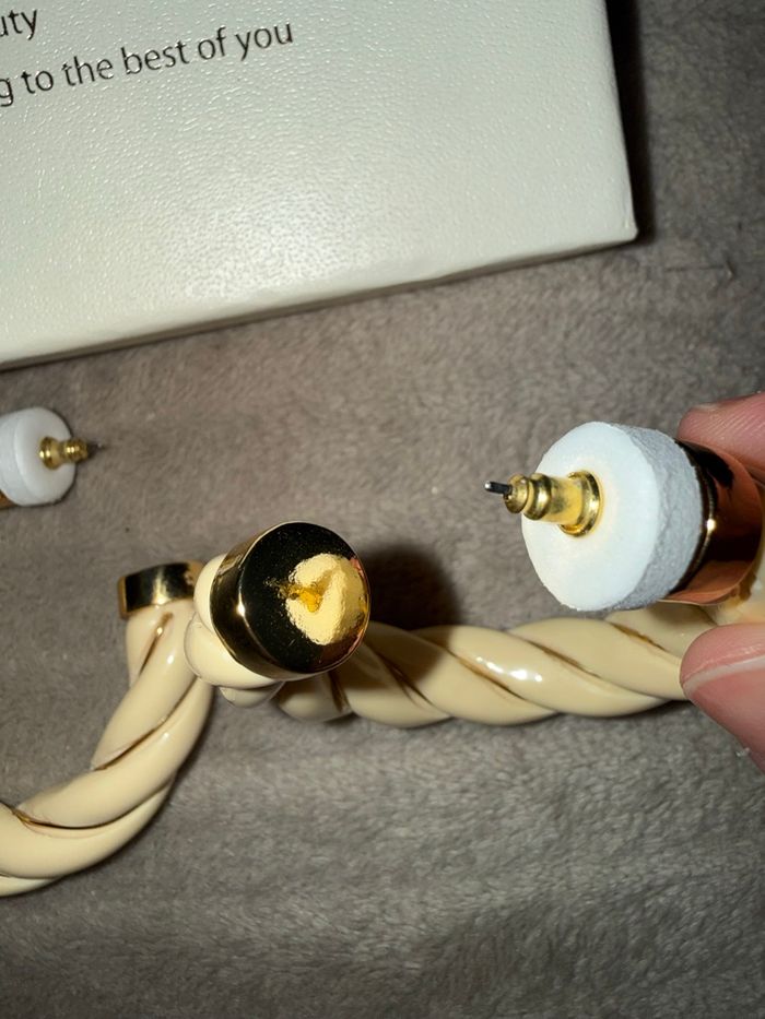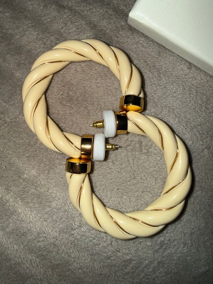 Jolies boucles d’oreilles créoles torsadées couleur crème avec détails dorés. Neuf avec la boîte légère trace voir sur les photo 4