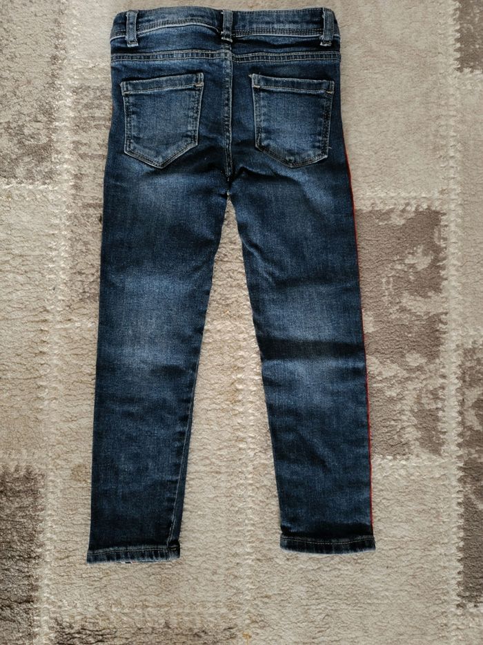 Jean slim bleu foncé avec bande rouge sur les côtés Kiabi taille 4 ans en très bon état très peu porté