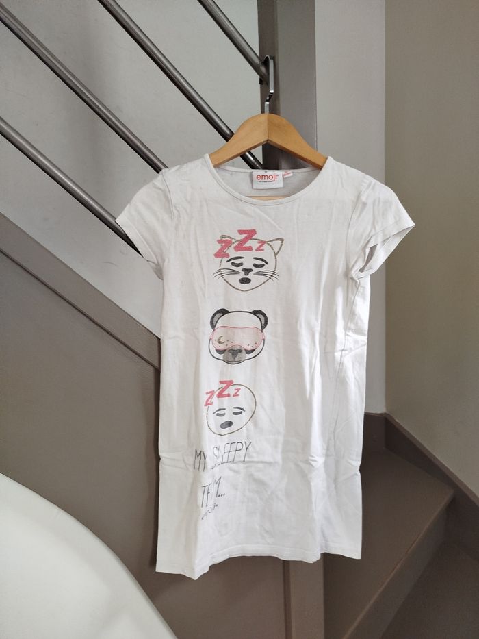 Pyjama fille sous la forme d'une chemise de nuit, emoji animaux endormis. Tâches (linge déteint) à l'avant et dans le dos. Marque Emoji, taille 8 ans. Réduction activée sur les lots. #fille #pyjama #chemisedenuit #pyjamadete #emoji #8ans