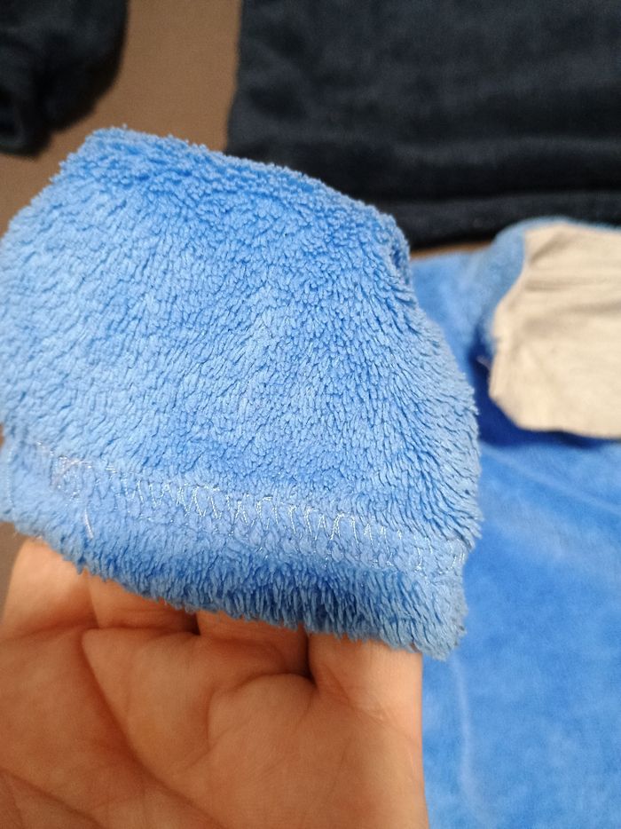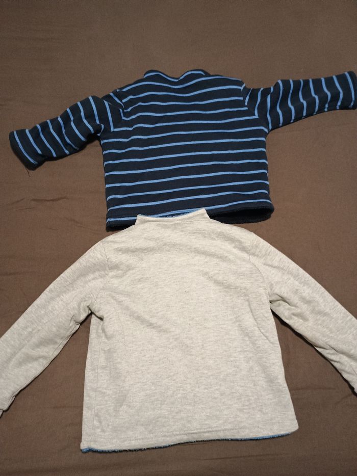 Pull moumoute réversible le bleu marine taille 4 ans et le gris bleu clair 5 ans effigie bleu marine camion de pompier et bleu clair requin
