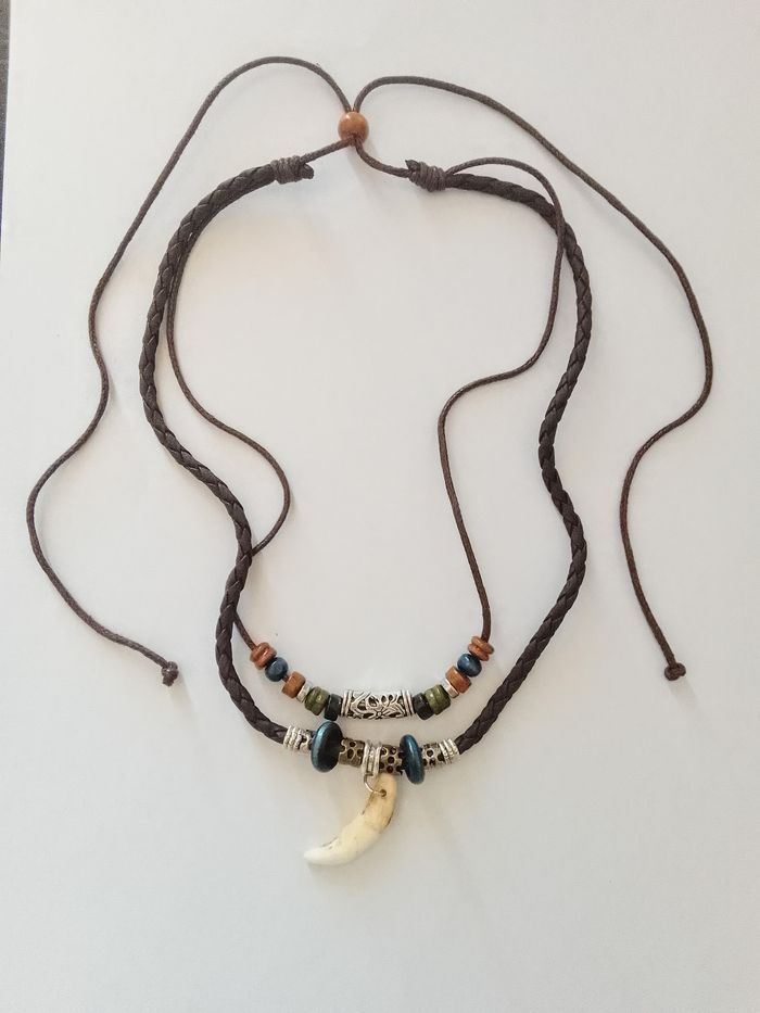 Collier corde réglable, dent. Pendentif : dent (ethnique, spirituel, bohème, idéal cadeau) DESCRIPTIF : Collier tissé en cuir P.U Couleur : marron, blanc, bleu. Diamètre pendentif : 3 cm H Envoi rapide et soigné.