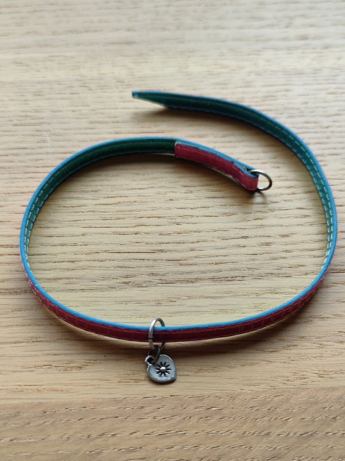 Bracelet à double rang rose et intérieur bleu turquoise. Simili cuir et avec un pendentif en forme de cœur au bout. Longueur totale déplié = 37cm. En excellent état. Jamais porté, sauf pour la photo. N'hésitez pas à regarder mes autres ventes, j’essaye de les classer au mieux. Je ne compose pas moi-même les lots pour vous laisser libre choix.