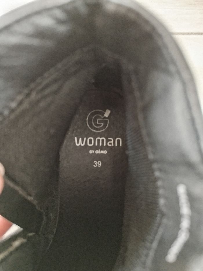 Paire de bottines à talons noires. Bout de la bottine droite un peu éraflé. Hauteur talon environ 3.5cm. Marque Gémo, pointure 39. Réduction activée sur les lots. #femme #bottines #gemo #pointure39