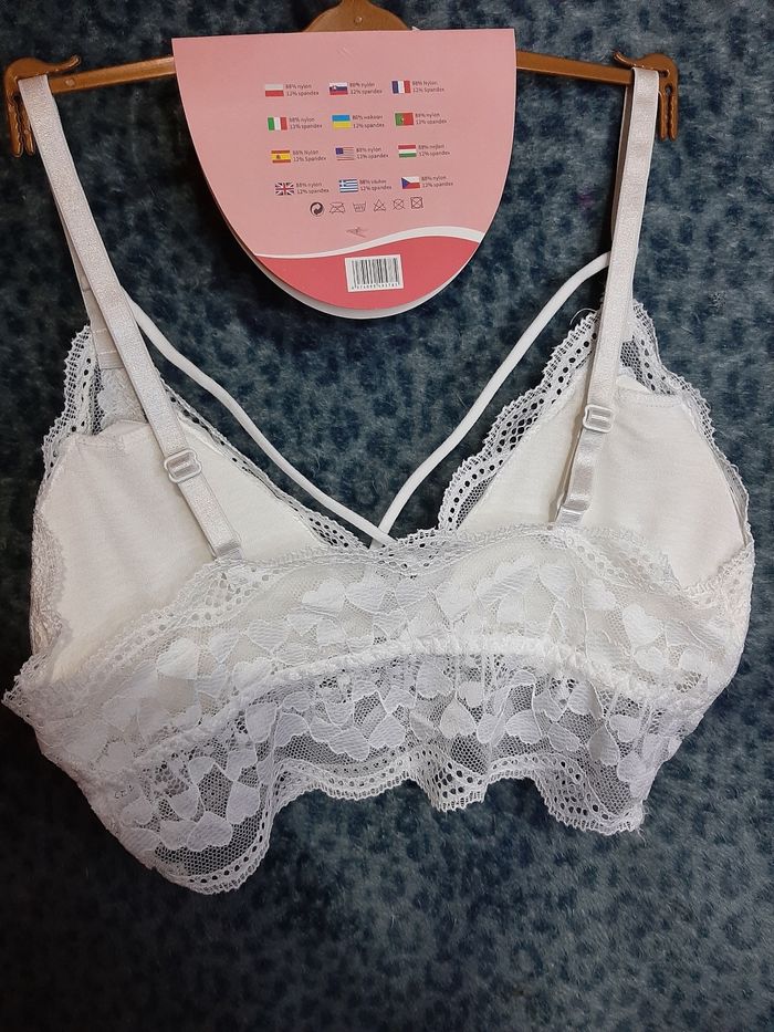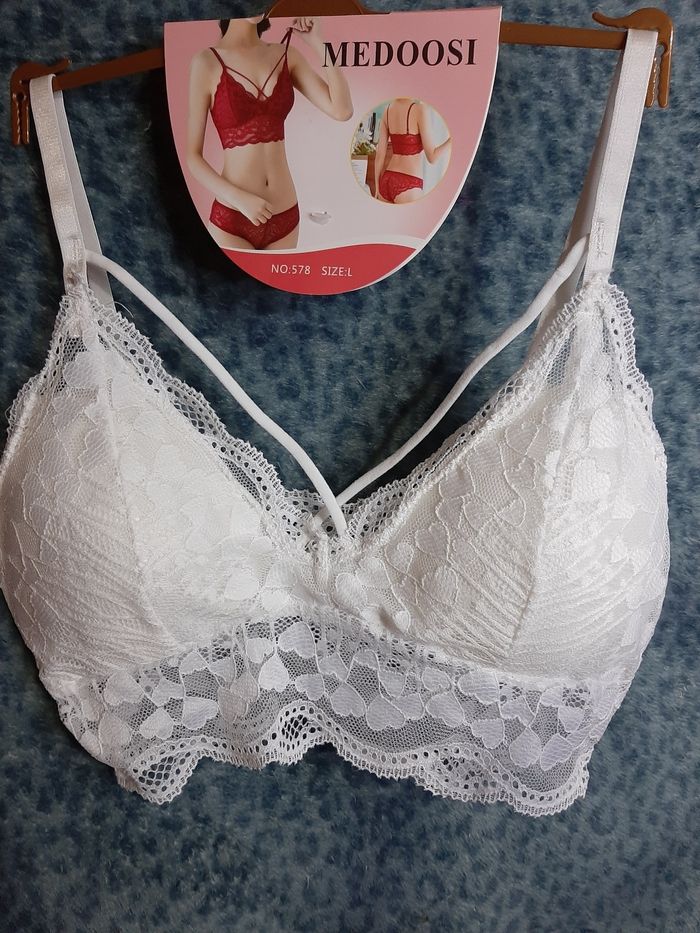 Soutien-gorge L blanc. Croisement sur le devant. Motif cœur sur la dentelle. Neuf. Marque Medoosi. 8.00e. 2 de disponibles