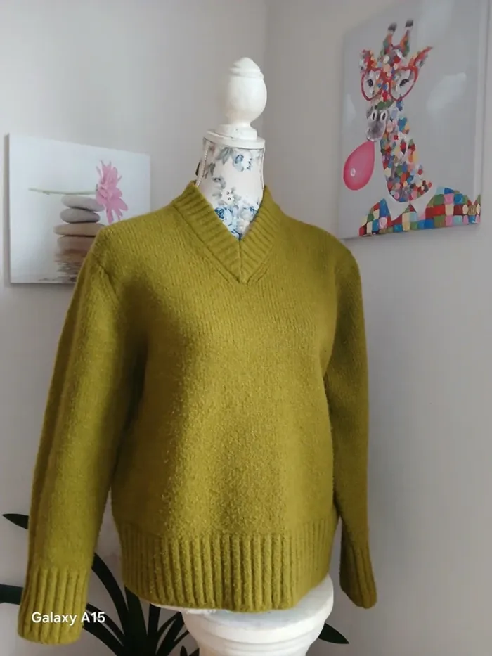 pull porté deux fois, chaud, épais le col V est peu décolté , plutôt haut