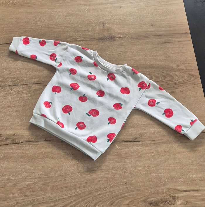 Pull type sweat à motifs pommes rouges, fourré à l'intérieur Primark taille 12-18 mois (86cm, correspond à du 18-24 mois) Bon état
