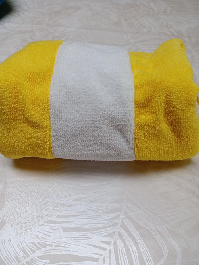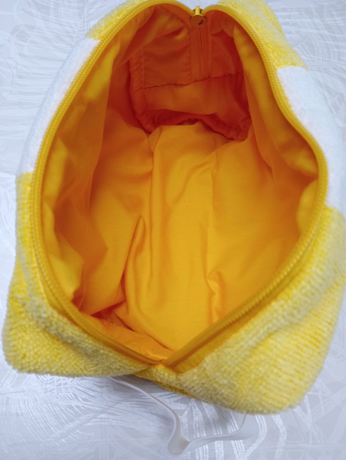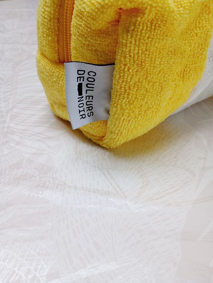 Trousse en tissu éponge, jaune et blanche. Dimensions : 21 x 16 x 8 cm. Marque : Couleurs de Noir (marque belge). Valeur neuve : 17,90 €. Neuve.