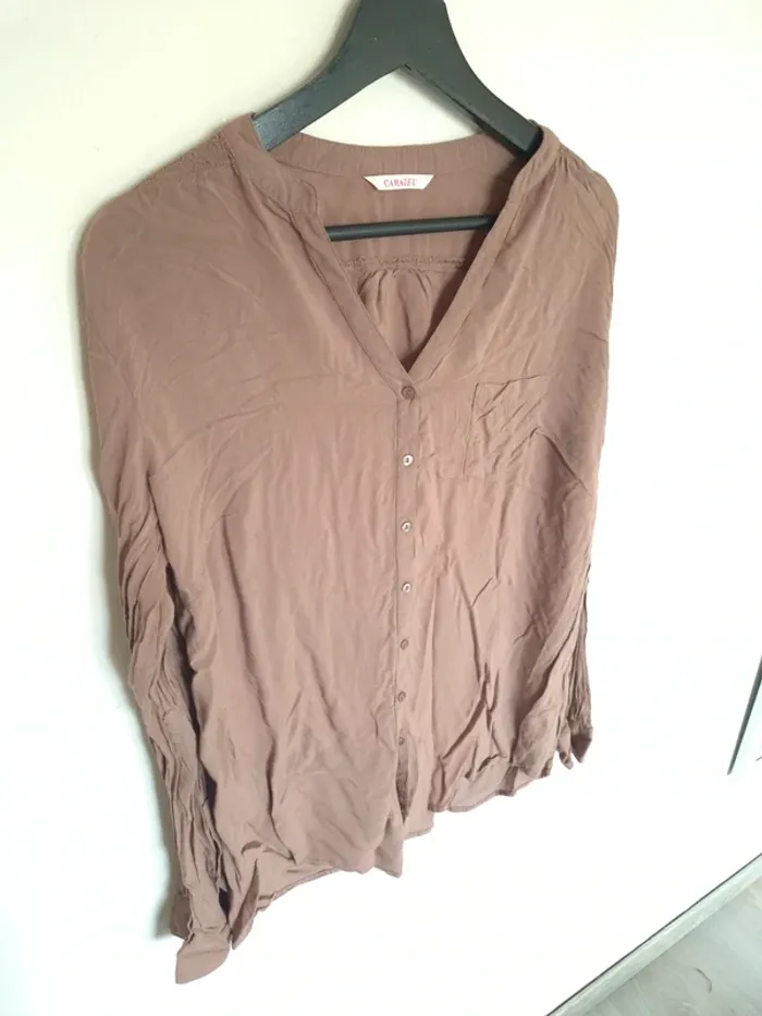 Blouse marron, uni, manche longue, boutonnée sur le haut, ➡️Largeur à plat sous les bras 54 cm ➡️Longueur 65 cm ➡️100% viscose ⭐ Excellent état ✈Envoi rapide des colis 💗 Abonnez vous à mon profil, nombreux articles ajoutés régulièrement ! 🌸 Tapez Laetitresors pour voir mes annonces #laetitresors_blouse44 #blouse #uni #camaieu #manche #longue #chemisier #chemise #marron #beige #laetitresors
