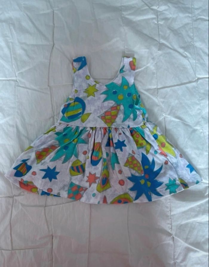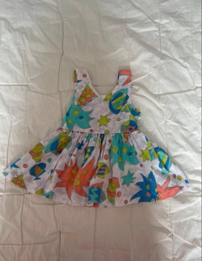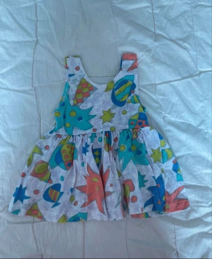 Vends robe grise avec motifs multicolores . Les dimensions sont : Longueur 29cm D’aisselles à aisselles 22 cm D’épaules à épaules 15cm. Je la vends 1 euros
