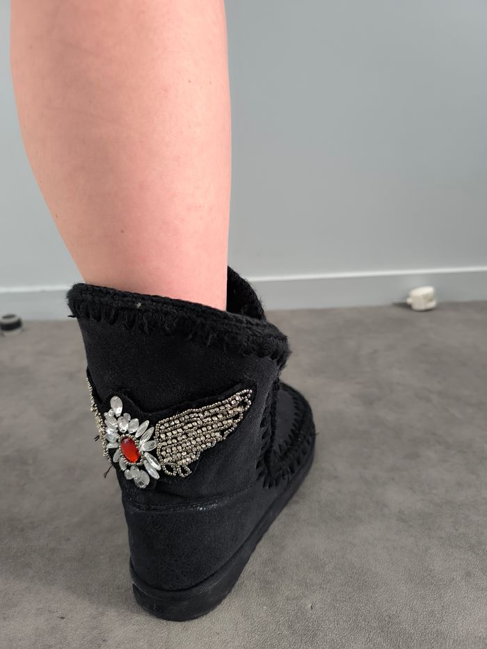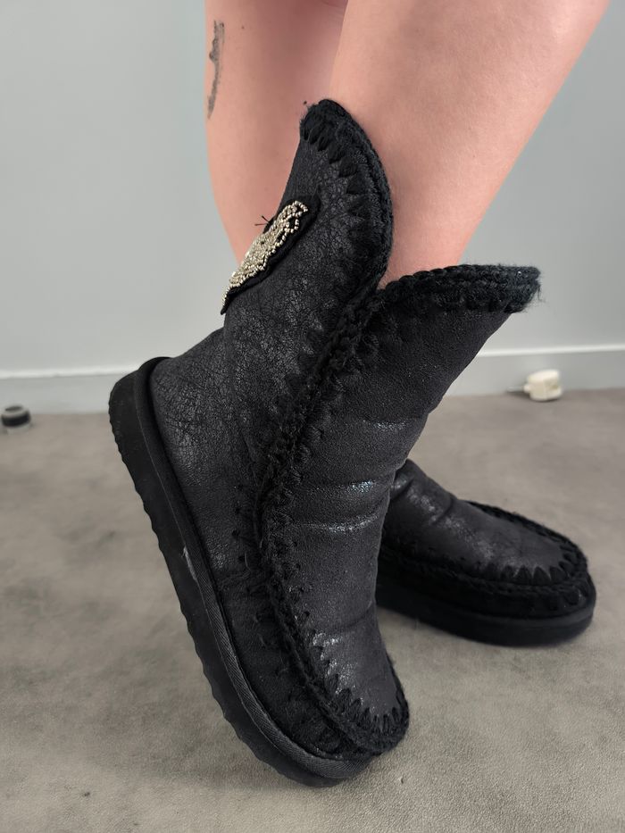 Superbes bottines fourrées noires façon mou portée 2 Fois par temps sec comme neuve Motif à l'arrière de la bottine T39