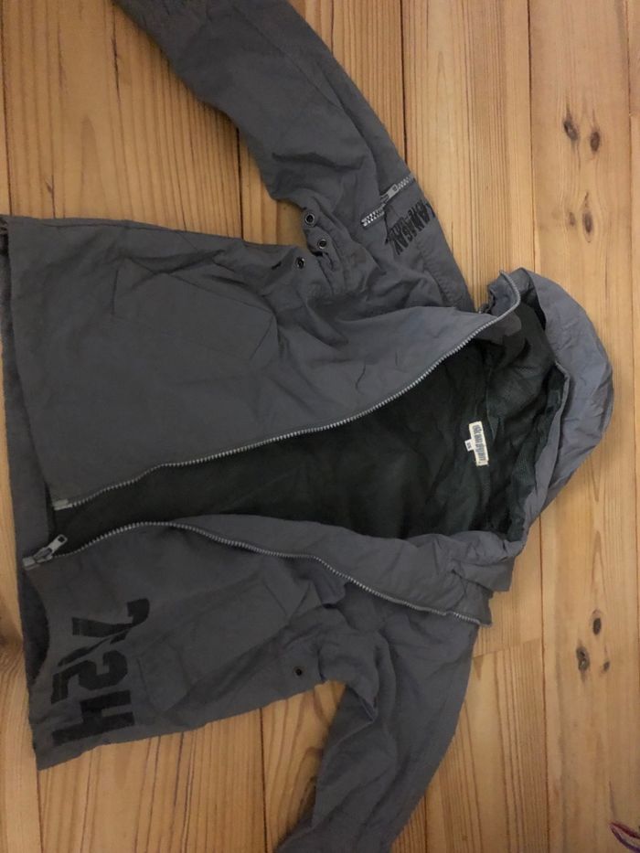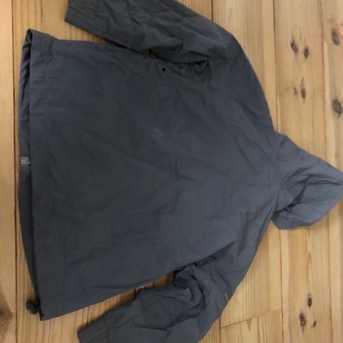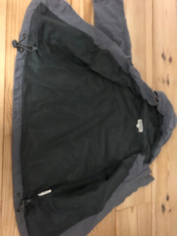 Coupe vent gris en très bon état, fermeture éclair , système serrage cordon capuche et taille, poches latérales