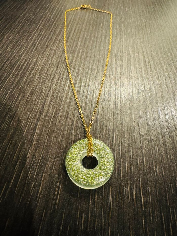 Jolie collier en acier doré + pendentif rond vert clair pailleté Très bon état Jamais porté