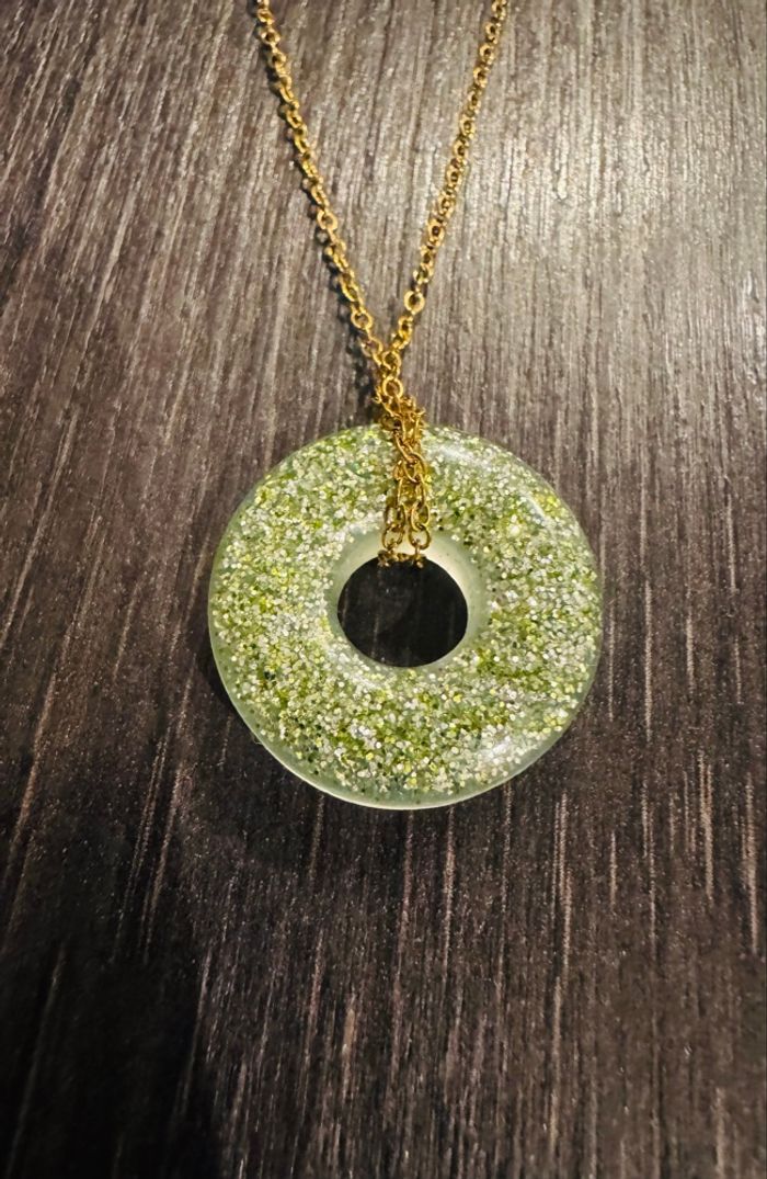 Collier + pendentif rond vert pailleté - photo numéro 1