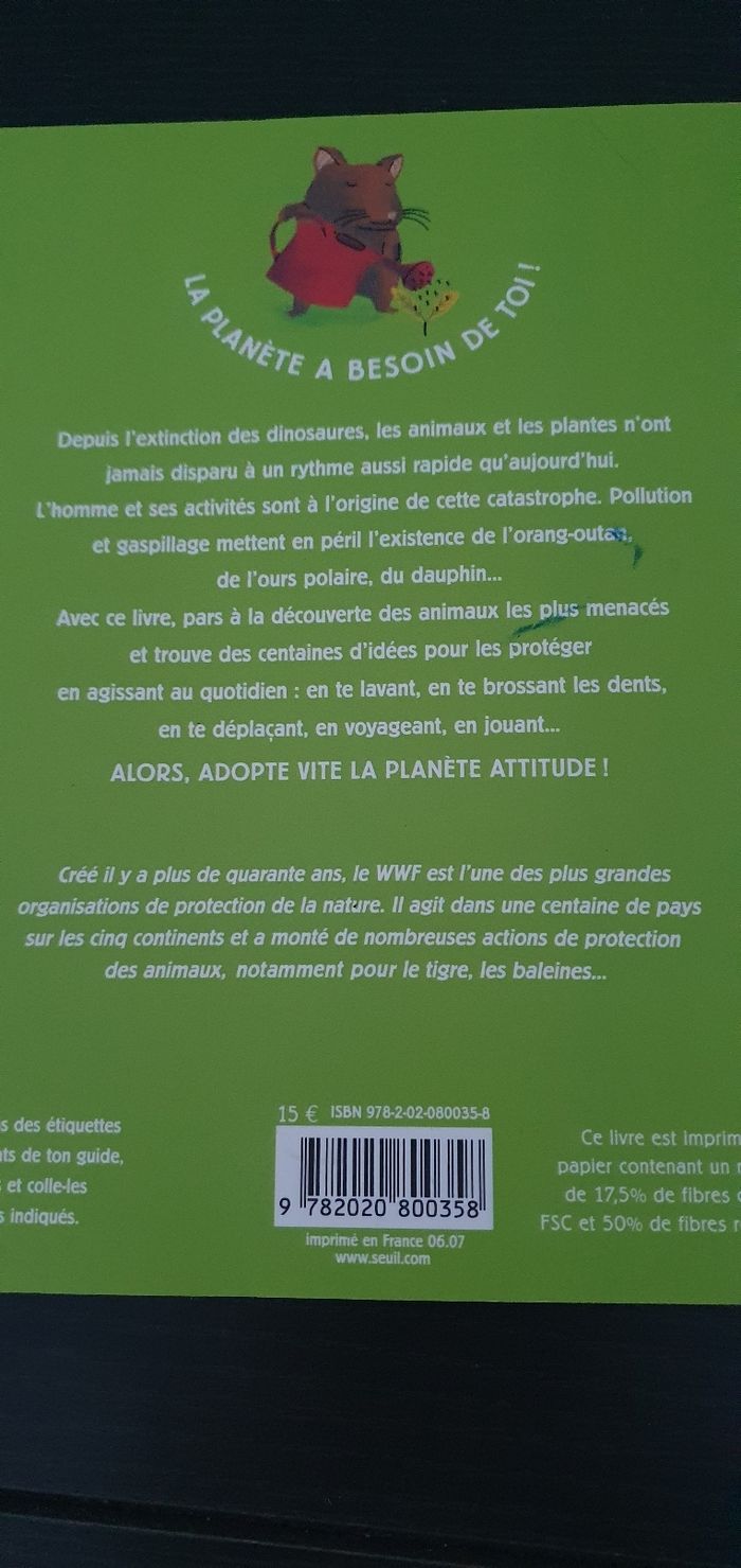 Je vends "Planète Attitude Junior", un livre éducatif destiné aux enfants et adolescents qui souhaitent en apprendre davantage sur la protection de la nature et la sauvegarde des animaux.