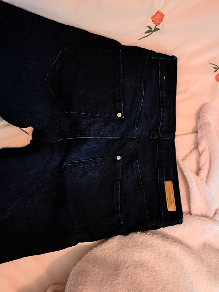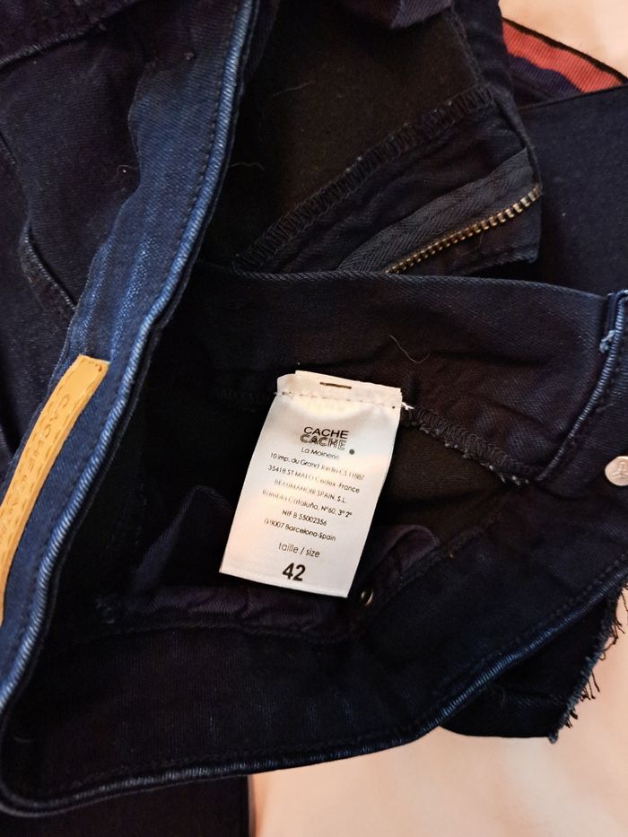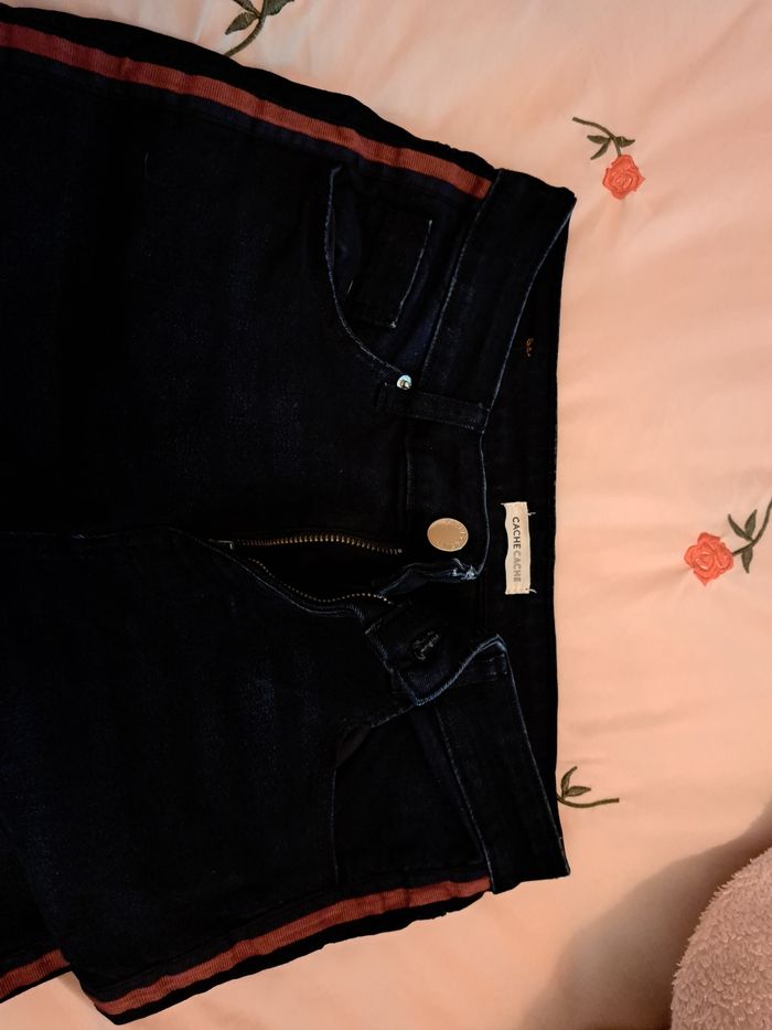 Vend un jeans. Bleu foncé avec rayures rouge. Poches à l'avant et à l'arrière.