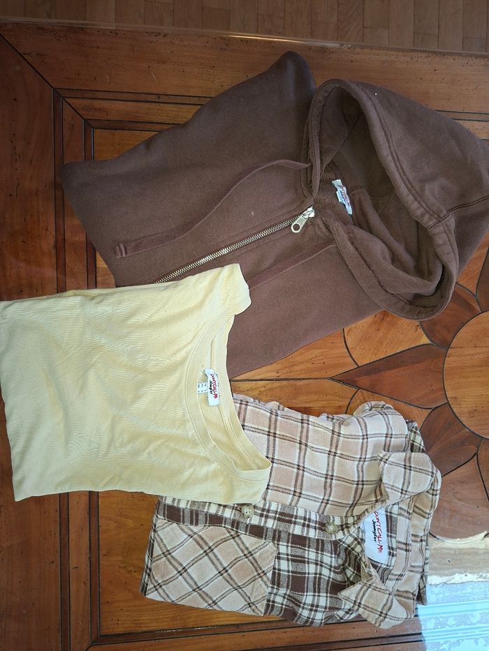 Gilet sweat à capuche S/M Chemise ou sur chemise M Tee shirt S ,taille assez grand Tout porté par la même personne