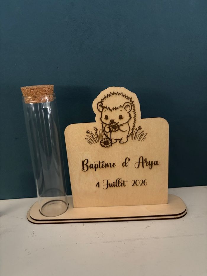 ✨ Support à dragées personnalisé en bois ✨ Support en bois naturel, personnalisé par gravure (prénoms, date, événement). Parfait pour mariage, baptême, communion ou anniversaire. 🌿 Fabrication artisanale 🎁 Élégant souvenir pour vos invités 💶 Prix : 4€ l’unité Tube et dragées non fournis 📩 Personnalisation sur commande