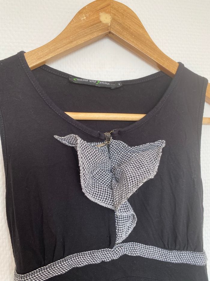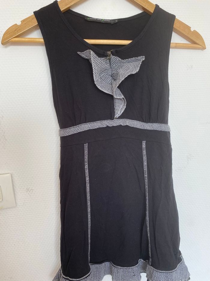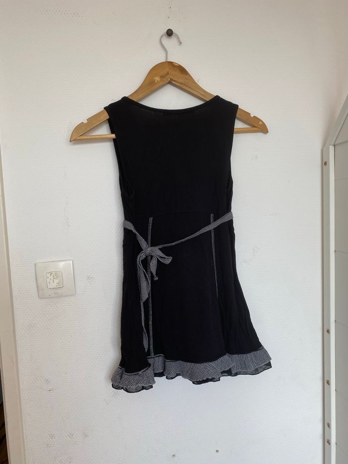 Je vends ce top sans manches noir avec un motif graphique original. Une pièce tendance et élégante, parfaite pour créer des looks variés au quotidien ou en soirée. - Type de produit : Top sans manches - Univers : Femme - Taille : 36 - S - Couleur : Noir - Caractéristiques : Motif graphique, Détails contrastants gris, Volants à l'ourlet