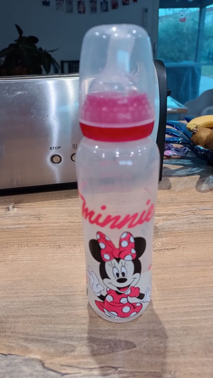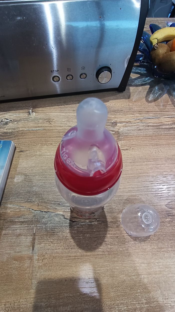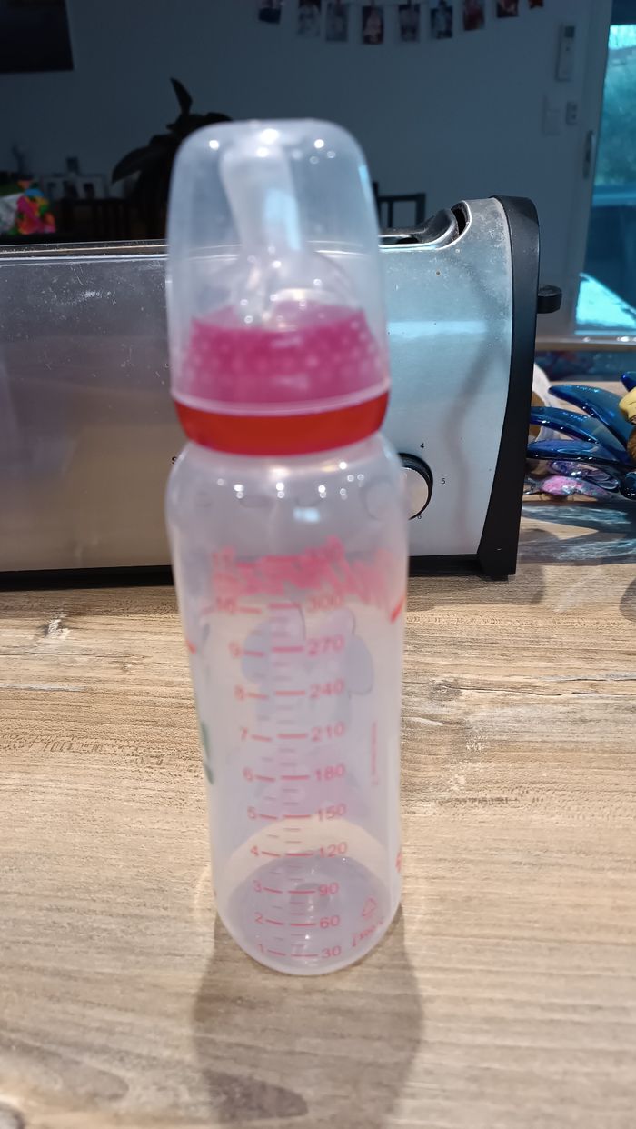 Biberon en plastique, tétine plate +12m – Liquides épais et céréales, neuve, de marque tigex, très bon état. Possibilité de faire des lots