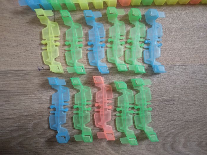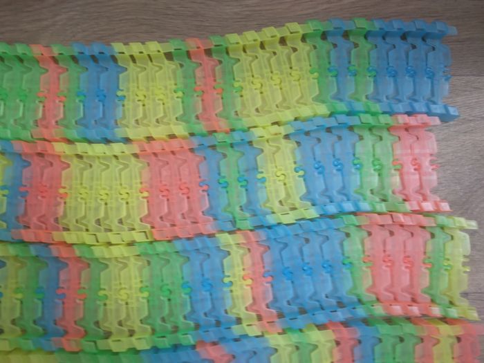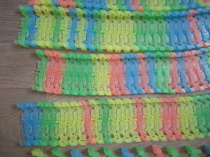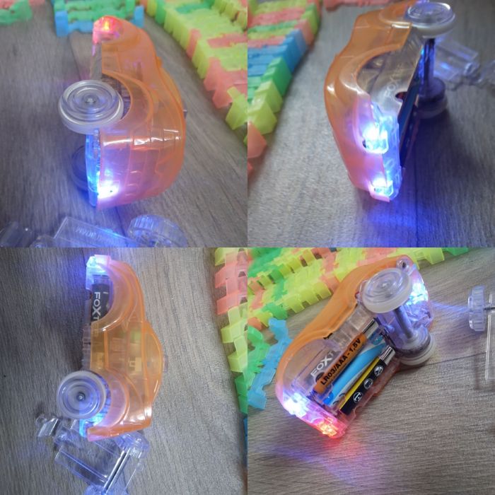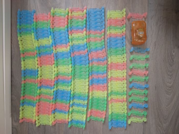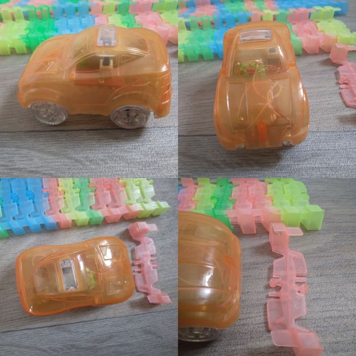 Circuit magic traces, créé un super circuit plat ou en boule , modulaire Voiture en état de marche et lumineux ( voir photo , piles non fourni) Sur la dernière photo certaine manque un petit morceau sur le bord mais ne gène pas le raccordement