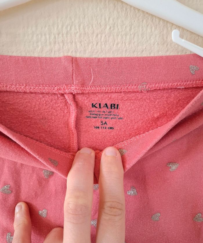 Je vends un legging de couleur rose à motifs (des cœurs dorés) venant de chez Kiabi. Il possède une doublure chaude à l'intérieur. Taille : 5 ans - 108/113 cm. Utilisé mais reste en bon état.