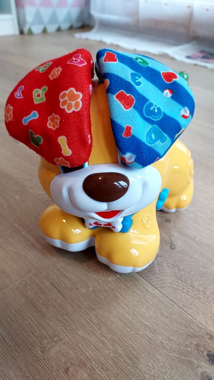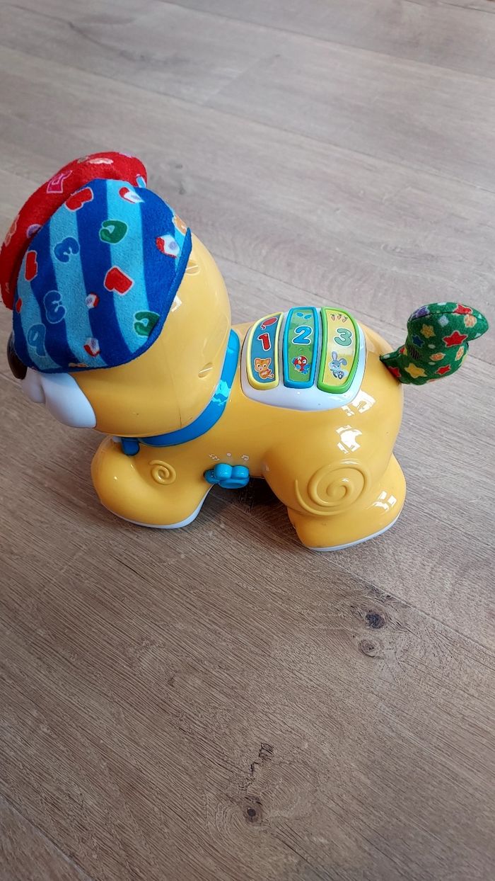Voici le petit chien qui joue à coucou de la marque Clémentoni. Il incite bébé à ouvrir ses oreilles en appuyant sur l'os. Il a également sur son dos des boutons avec des animaux pour que bébé puisse apprendre les sons. Il bouge tout en chantant pour inviter bébé à faire du quatre pattes. En bon état. ( marche avec piles non fournies) Possibilité de mettre en muet Langues : français/ allemand.