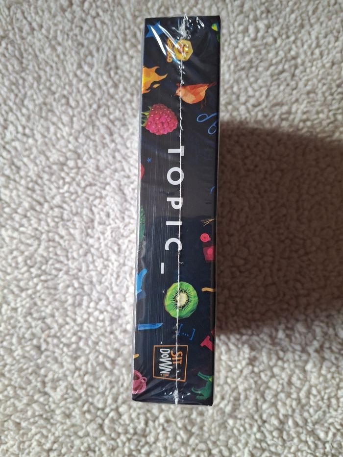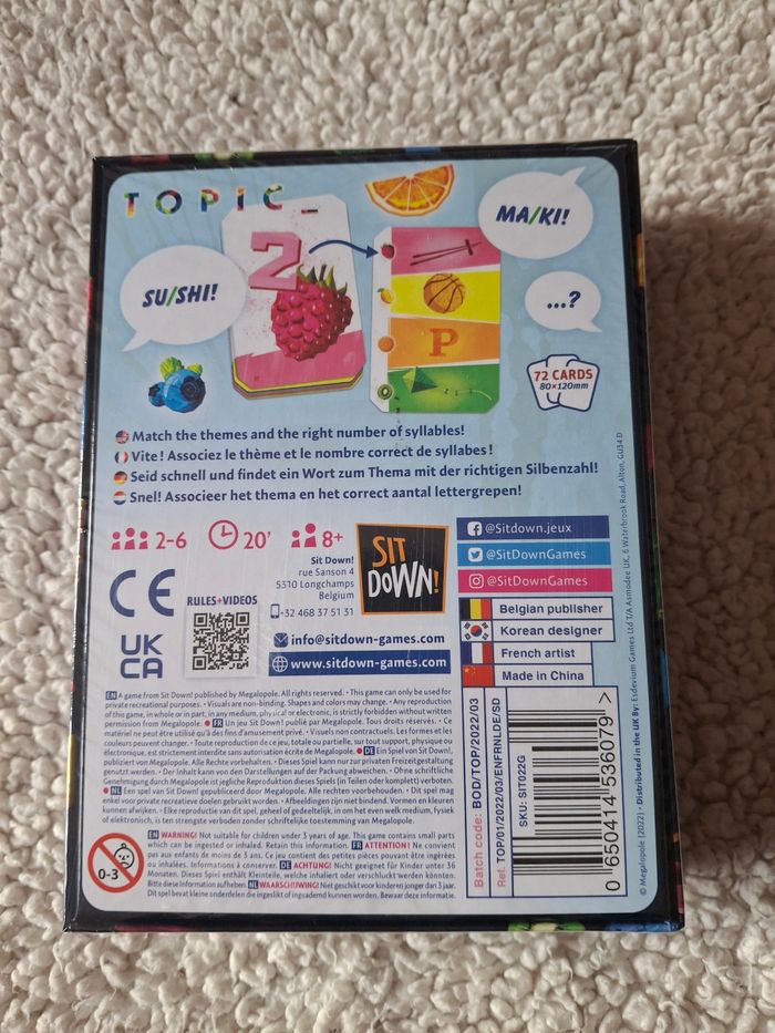 Topic jeu de société jamais ouvert (sous blister) A partir de 8 ans Pour 2 à 6 joueurs Durée d’une partie : moins de 40 minutes Un jeu de mots et de rapidité Associez les thèmes et le bon nombre de syllabes pour gagner la partie! Le joueur avec le moins de cartes devant lui à la fin de la partie gagne. But du jeu: Ne pas être le dernier joueur à annoncer un mot selon un thème donné, afin d’éviter de recevoir des cartes. Le joueur ayant le moins de cartes en fin de partie remporte la victoire. Une partie est divisée en manches. Chaque manche se déroule en 3 phases : Révélation Annonces Fin de manche Les joueurs jouent simultanément. Le plus rapidement possible, tous les joueurs doivent essayer d’annoncer un seul mot correspondant au thème et au nombre de syllabes requis pour la manche en cours. Lorsqu’il ne reste qu’un joueur à ne pas avoir annoncé de mot, la manche prend fin.