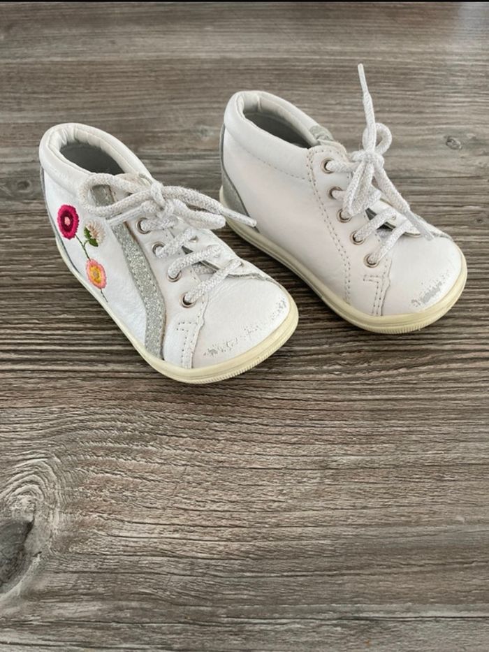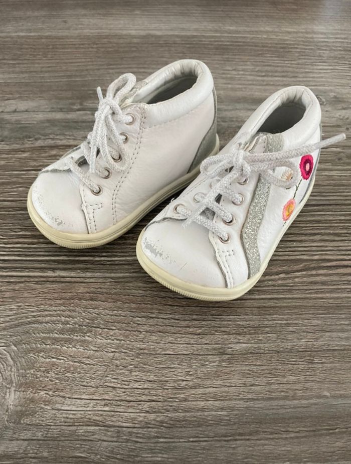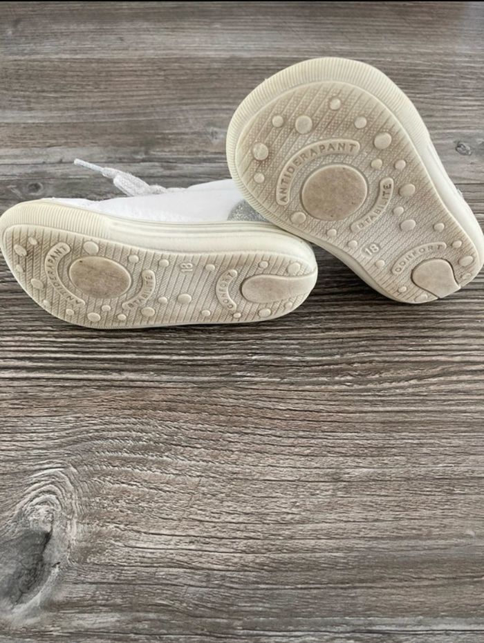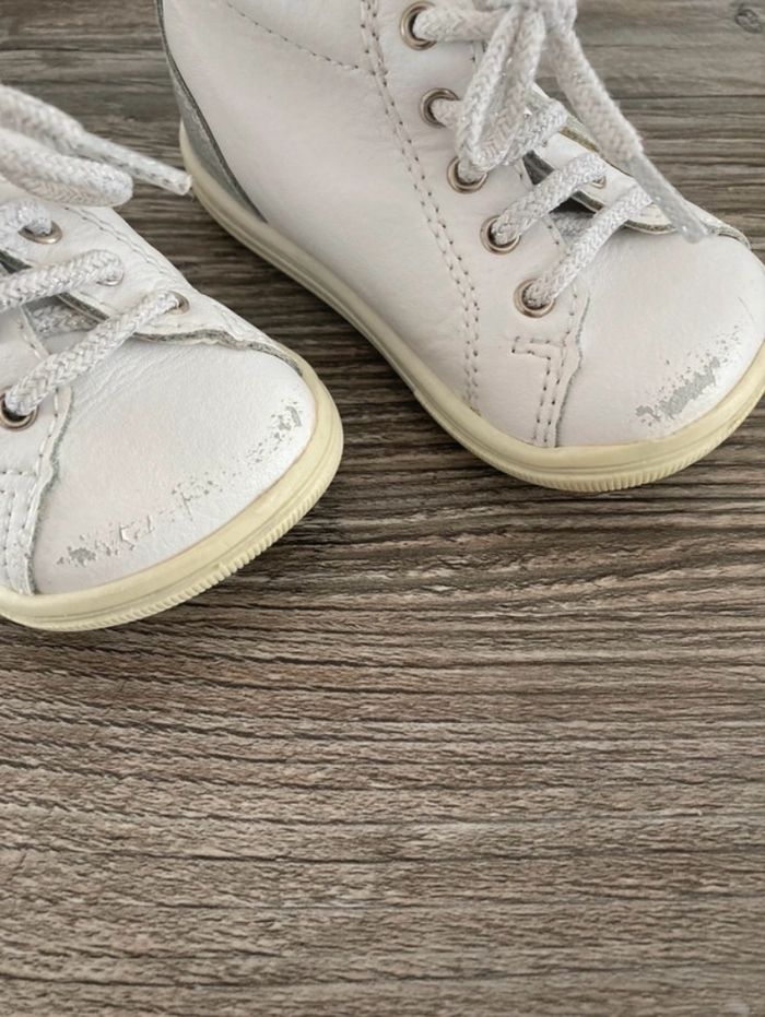Chaussures en bon état, usure sur l’avant. Taille 17 (environ 11,5 cm).